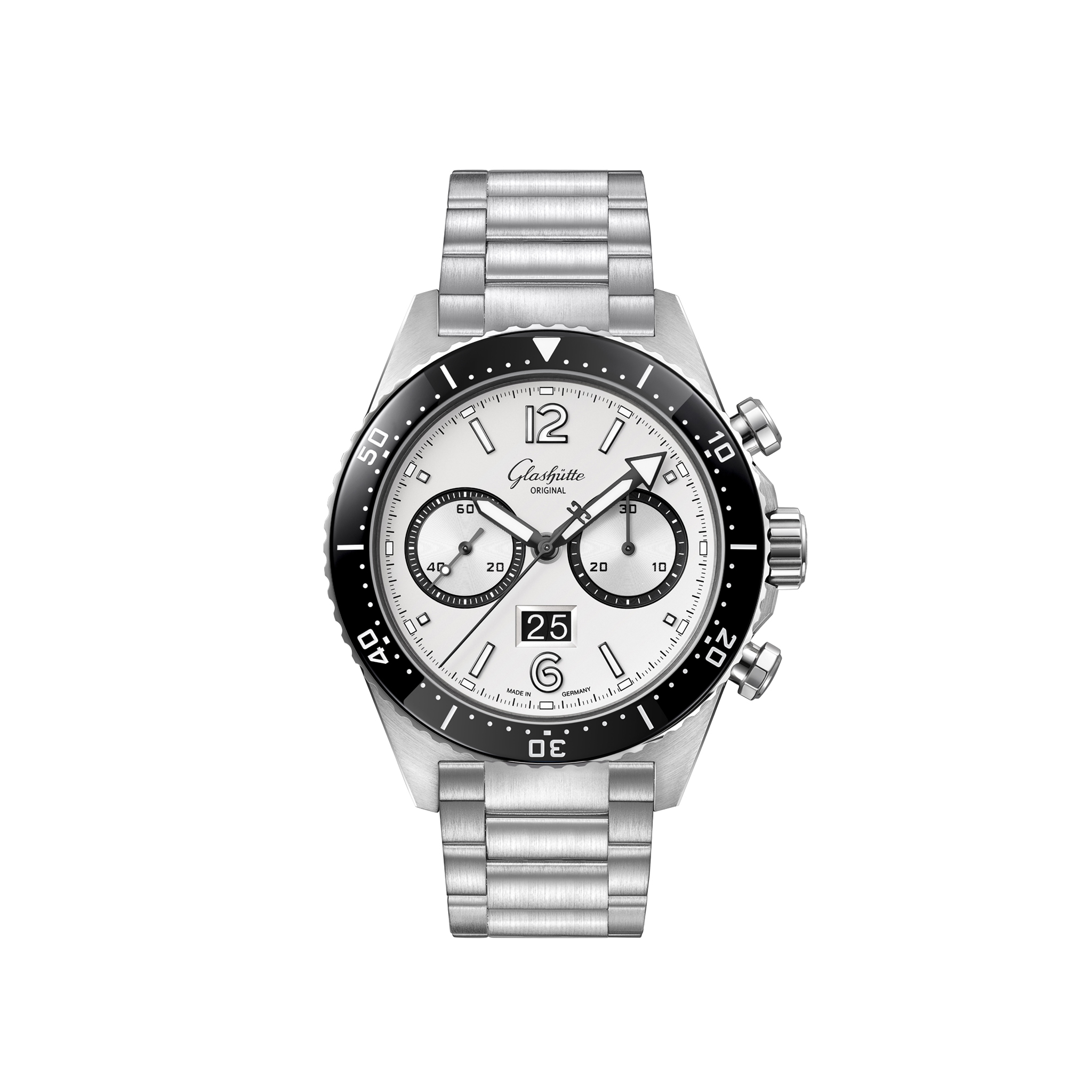 Die Glashütte Original SeaQ Chronograph verfügt über ein 43,2-mm-Edelstahlgehäuse mit einer einseitig drehbaren Lünette aus schwarzer Keramik. Das "Silver Screen"-Zifferblatt sorgt für perfekte Ablesbarkeit, ergänzt durch schwarze Zeiger und Super-LumiNova®-beschichtete Indizes. Angetrieben vom Kaliber 37-23 bietet sie eine Gangreserve von 70 Stunden und eine Flyback-Chronographenfunktion. Wasserdicht bis 300m.