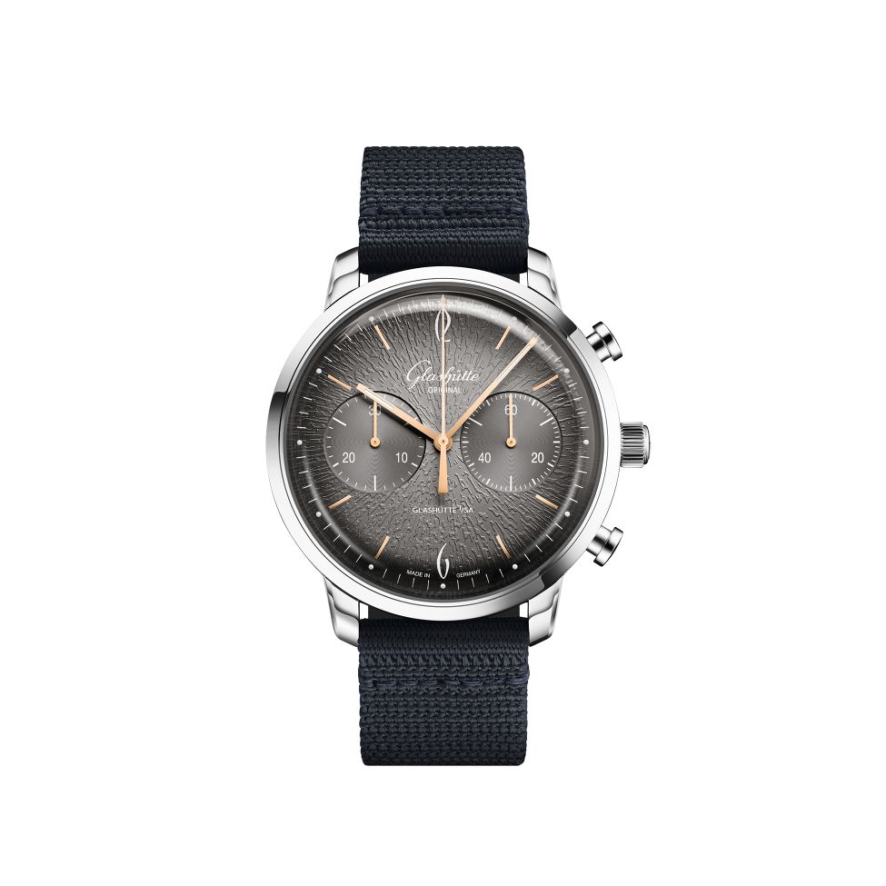 Glashütte Original wirft einen Blick zurück und verbindet in der Sixties Kollektion Retro-Eleganz mit modernster Funktionalität. Das Edelstahlgehäuse präsentiert ein von Grau zu Schwarz verlaufendes Zifferblatt mit goldfarbenen Indizes und Zeigern sowie Anzeigen für die kleine Sekunde und den 30-Minuten-Zähler. Der transparente Gehäuseboden ermöglicht einen Blick auf das Automatikwerk Kaliber 39-34 mit einer Gangreserve von 40 Stunden. Ein synthetisches Textilarmband in Blau rundet die Uhr ab.