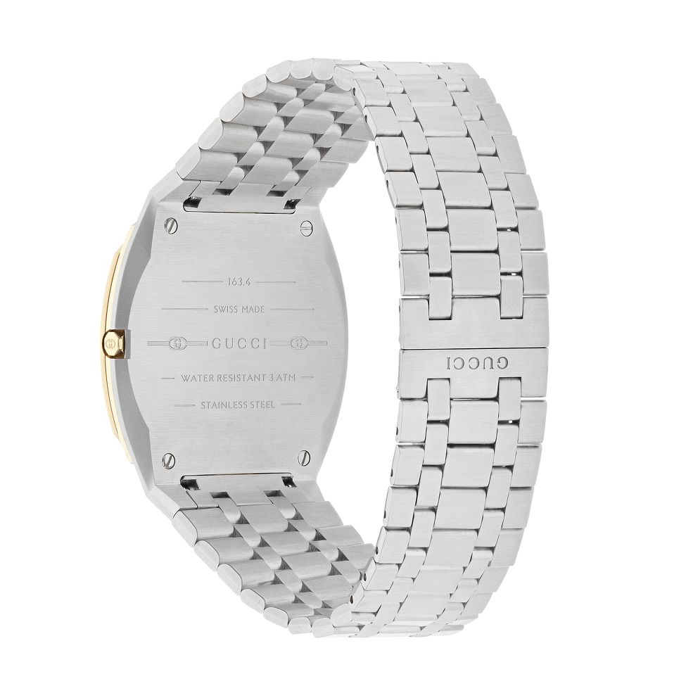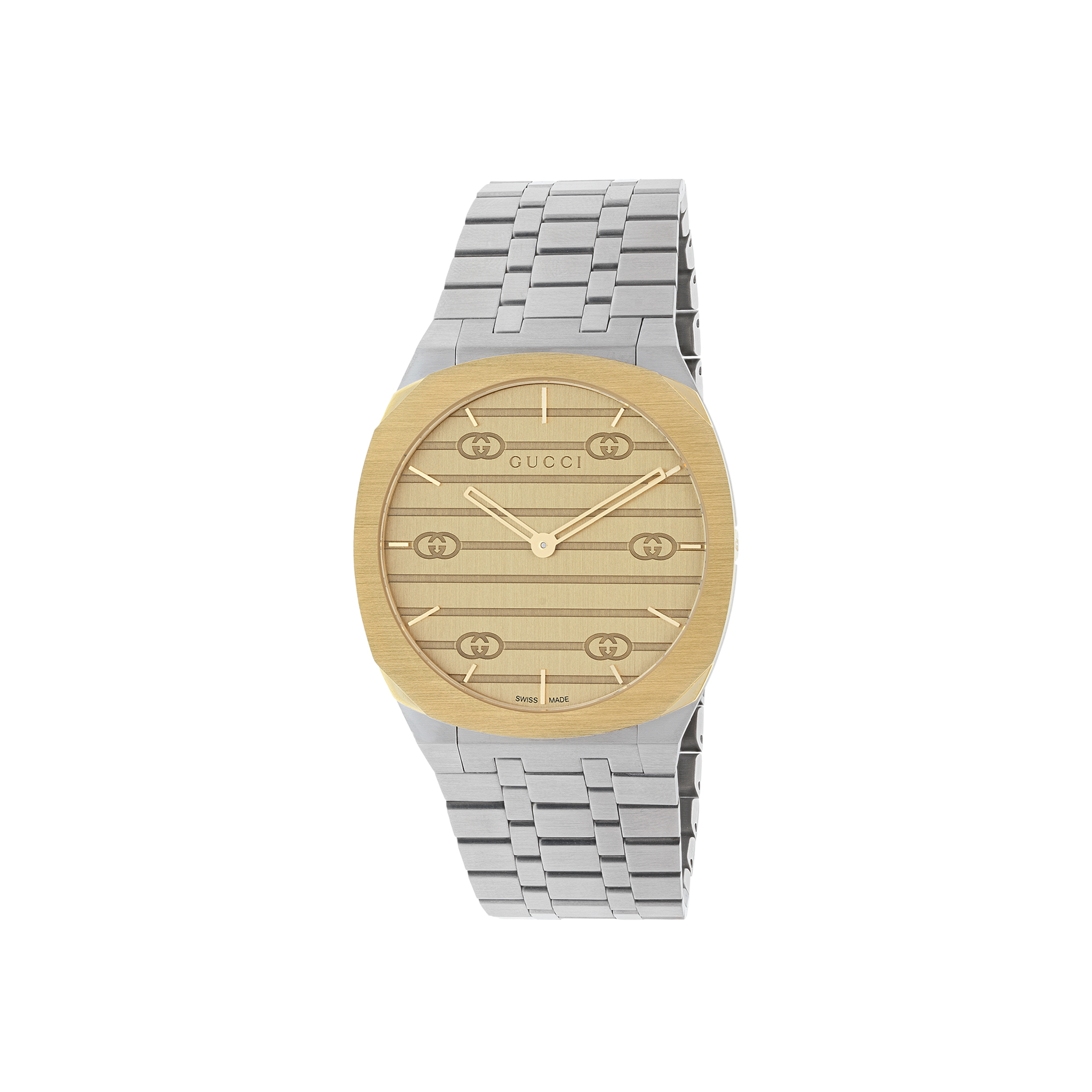 Diese Uhr verkörpert Eleganz und Modernität mit ihrem schlanken 38mm Gehäuse aus gelbem Gold und integriertem Armband. Mit einem goldfarbenen Zifferblatt und dem ikonischen GUCCI-Logo versehen, wird sie von einem Schweizer Quarzwerk angetrieben, das präzise Zeitmessung gewährleistet. Ihr minimalistisches Design wird durch ein kratzfestes Saphirglas ergänzt und bietet Alltagstauglichkeit und Stil. Diese Uhr ist ein Zeugnis für die zeitlose Handwerkskunst und den innovativen Geist der Marke.