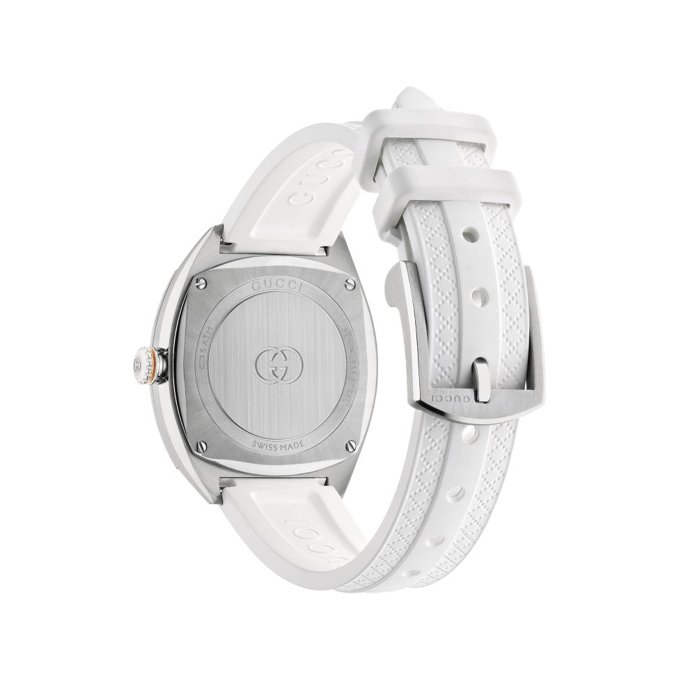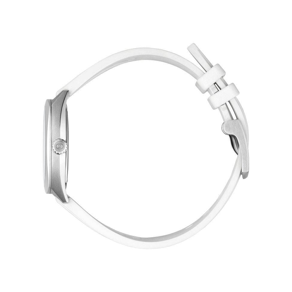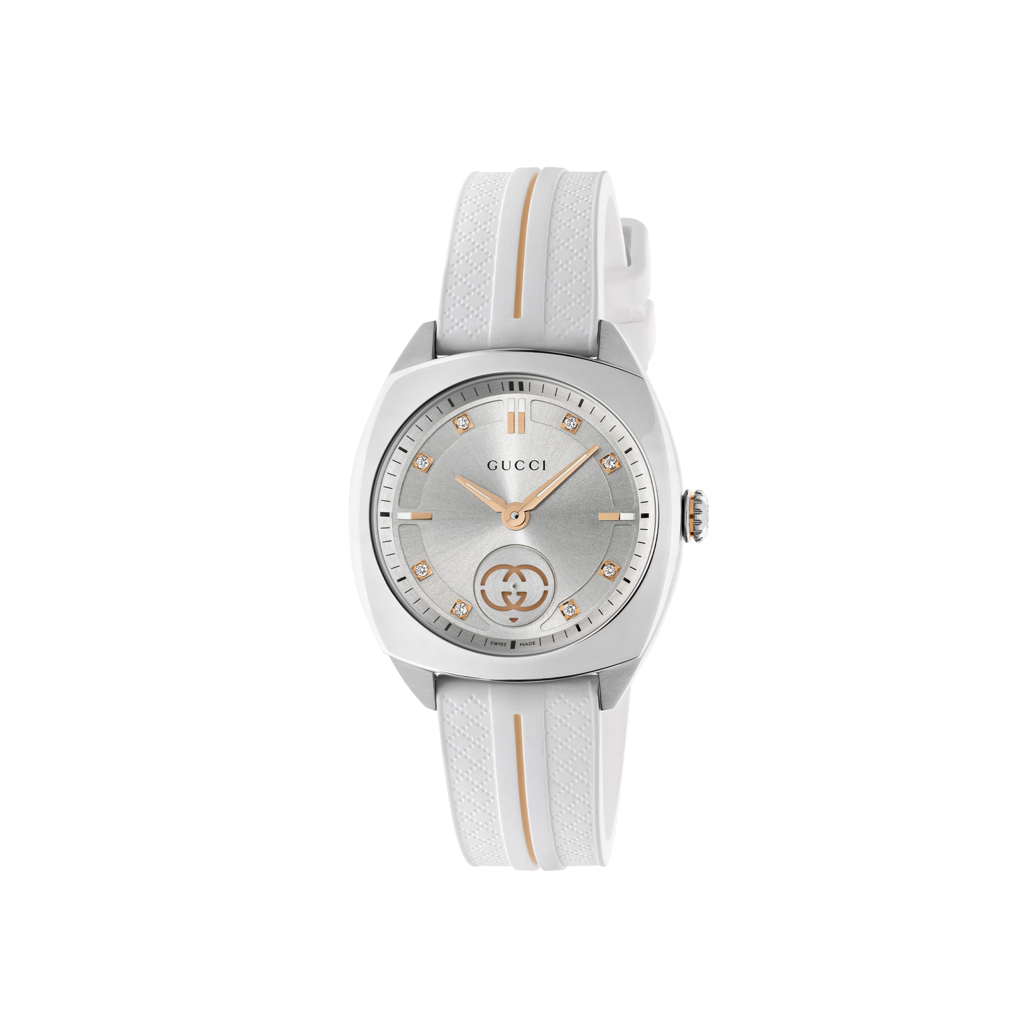Diese elegante Gucci Interlocking Uhr präsentiert sich mit einem 29 mm Edelstahlgehäuse, silberfarbenem Sonnenschliff-Zifferblatt mit 8 Diamanten, roségoldfarbenen Details und Interlocking-G-Sekundenanzeige. Sie verfügt über ein weisses Kautschukarmband, Saphirglas und ist bis 5 ATM wasserdicht.