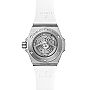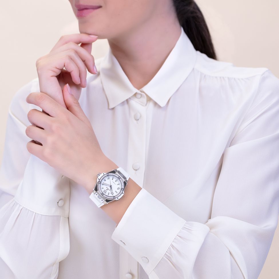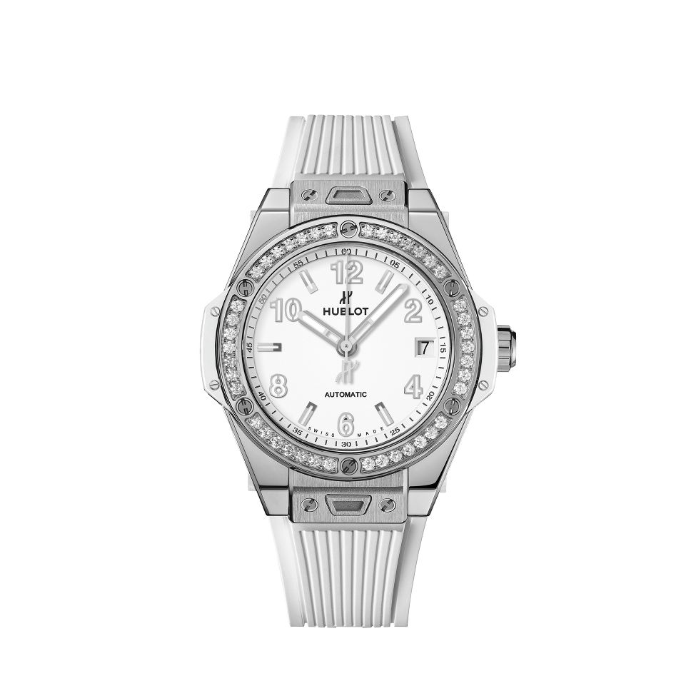 Hublot feiert mit der 39 mm One Click Steel White Diamonds The Art of Fusion und präsentiert das Gehäuse und die Lünette in satiniertem Edelstahl. Sechs H-Schrauben fixieren die mit 42 Diamanten besetzte Lünette, das mattweisse Zifferblatt präsentiert lumineszierende Zeiger und Indizes, die Datumanzeige liegt auf drei Uhr. Die Uhr wird vom automatischen HUB1710 Uhrwerk angetrieben, ein weisses, liniertes Kautschukarmband mit Faltschliesse rundet den Zeitmesser ab.