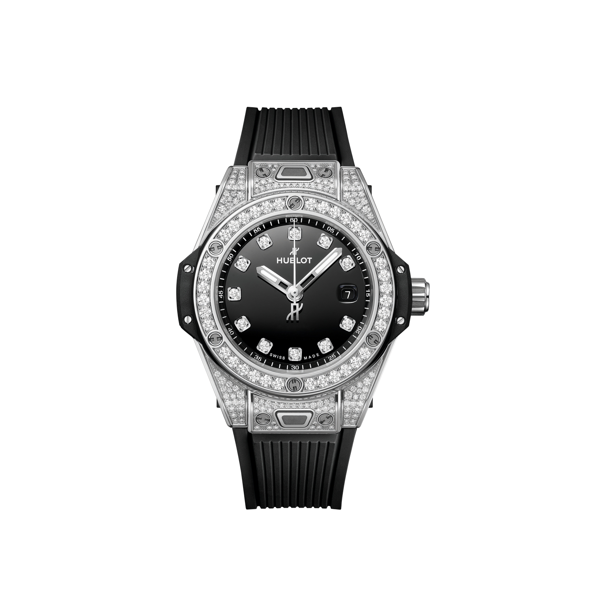 Hublot feiert mit der 33 mm One Click Steel White Diamonds The Art of Fusion und präsentiert ein mit 130 Diamanten besetztes Edelstahlgehäuse. Sechs H-Schrauben fixieren die mit 36 Diamanten besetzte Lünette, das mattweisse Zifferblatt präsentiert lumineszierende Zeiger und diamantbesetzte Indizes, die Datumanzeige liegt auf drei Uhr. Die Uhr wird vom automatischen HUB1120 Uhrwerk angetrieben. Ein schwarzes, liniertes Kautschukarmband mit Faltschliesse rundet den Zeitmesser ab.