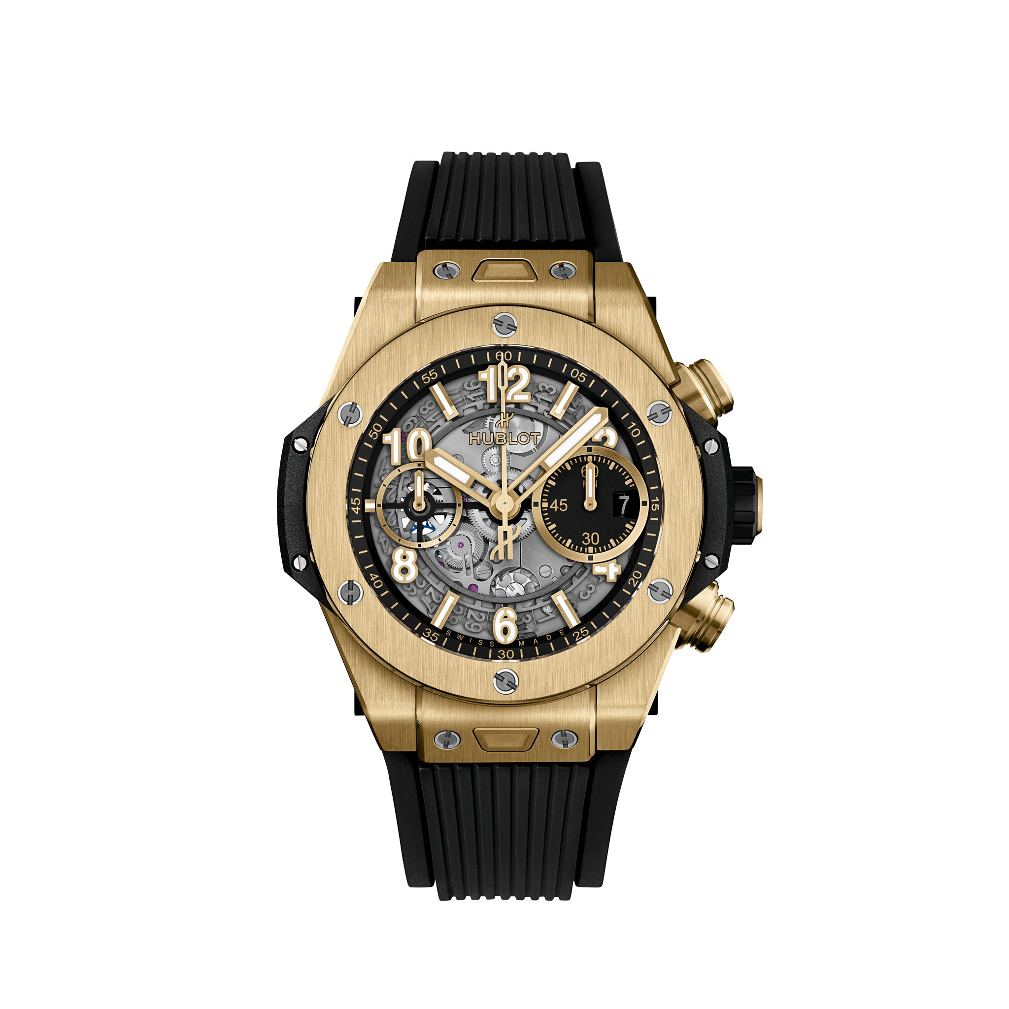 Hublot erweitert mit dem Unico Yellow Gold 42 mm die Big Bang Kollektion. Auf dem satinierten 18 Karat Gelbgoldgehäuse ist die Lünette mittels den typischen Titanschrauben fixiert und verdeckt die untere, zweite Lünette aus schwarzem Komposit-Harz. Auf dem skelettierten Zifferblatt ist die Datumanzeige in eine der Chronographenanzeigen integriert. Das Automatikwerk HUB1280 mit Flyback-Funktion bietet eine Gangreserve von 72 Stunden. Ein schwarzes, liniertes Kautschukarmband rundet die Uhr ab.
