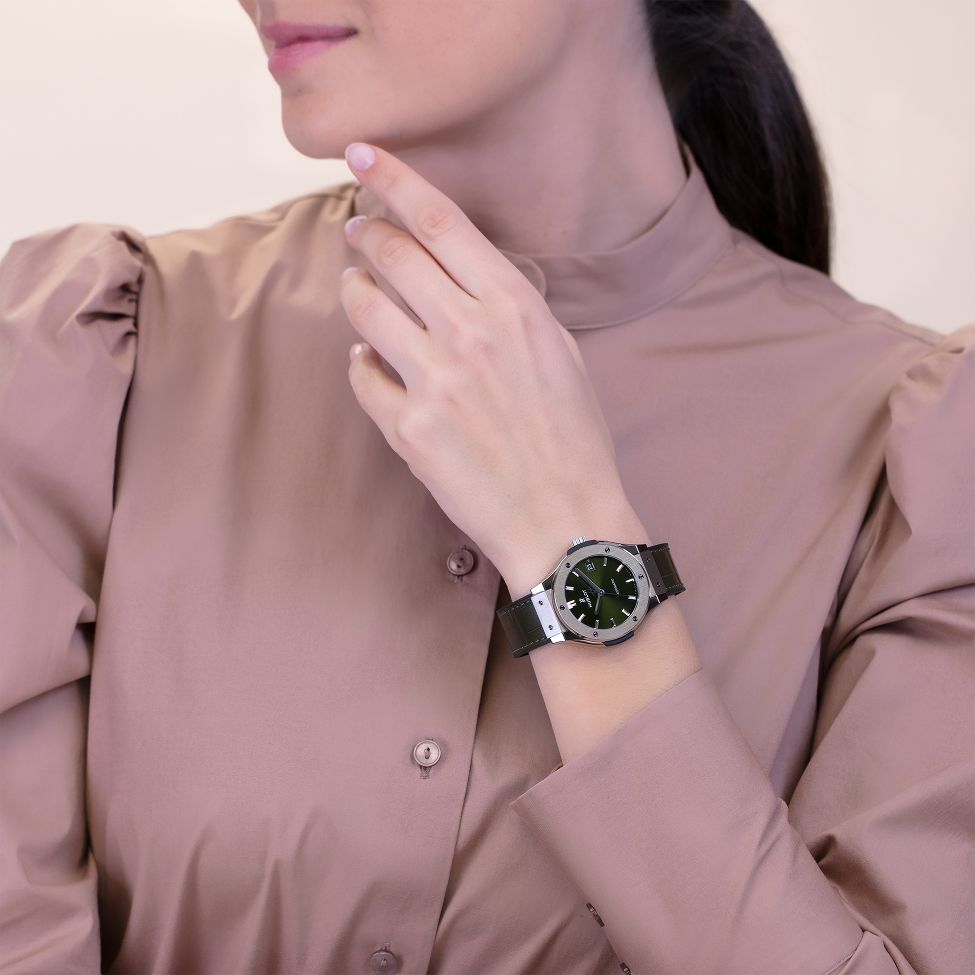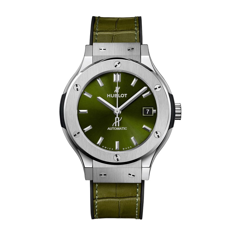 Mit der eleganten Titanium Green erweitert Hublot die Kollektion der Classic Fusion. Auf dem 38 mm Titangehäuse ist die Lünette mit den sechs markentypischen H-Schrauben aus Titan fixiert. Das grün satinierte Zifferblatt im Sonnenschliff präsentiert silberfarbene Indizes und Zeiger, die Datumanzeige liegt auf drei Uhr. Die Uhr verfügt dank dem HUB1110 Automatikwerk über eine Gangreserve von 42 Stunden. Ein grünes Alligatorleder Armband verleiht dieser Uhr den letzten Schliff.