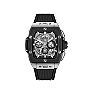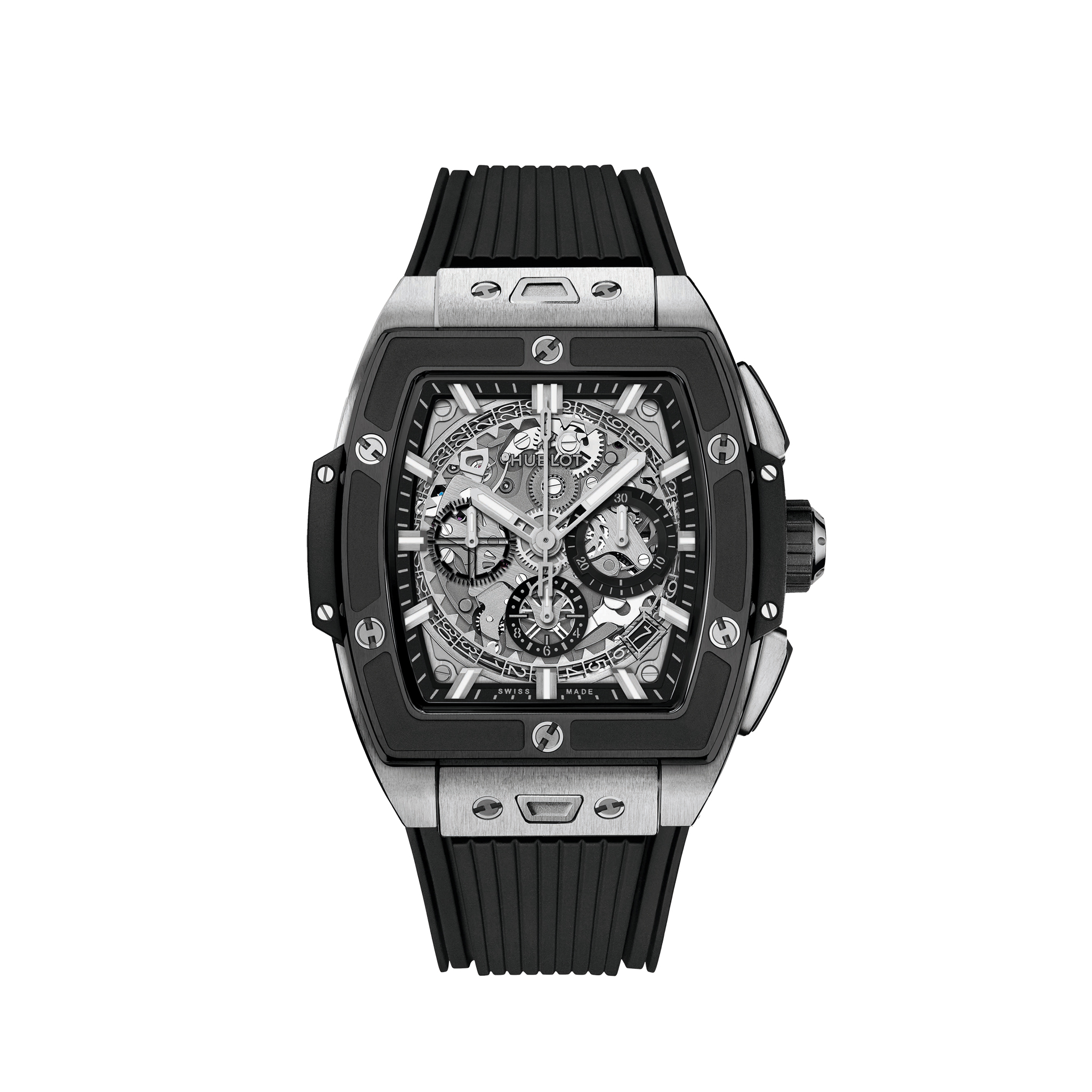 Mit der Spirit of Big Bang Titanium Ceramic feiert Hublot die Fusion von Design und Funktion. Das 42 mm satinierten Titangehäuse mit einer schwarzen Keramiklünette versehen, die mittels der sechs typischen Titanschrauben fixiert wird. Lumineszierende Indizes und Zeiger ergänzen das vollständig skelettierte Saphirglaszifferblatt mit Chronographen- und Gangreservenanzeige. Dank des HUB 4700 Werks hat dieser Chronograph eine Gangreserve von 50 Stunden. Ein schwarzes Armband aus Kautschuk rundet den Zeitmesser ab.