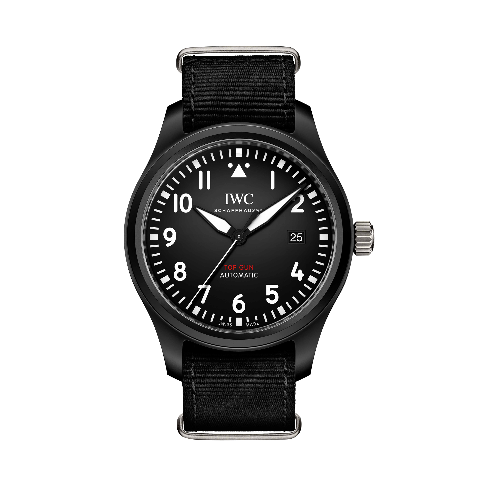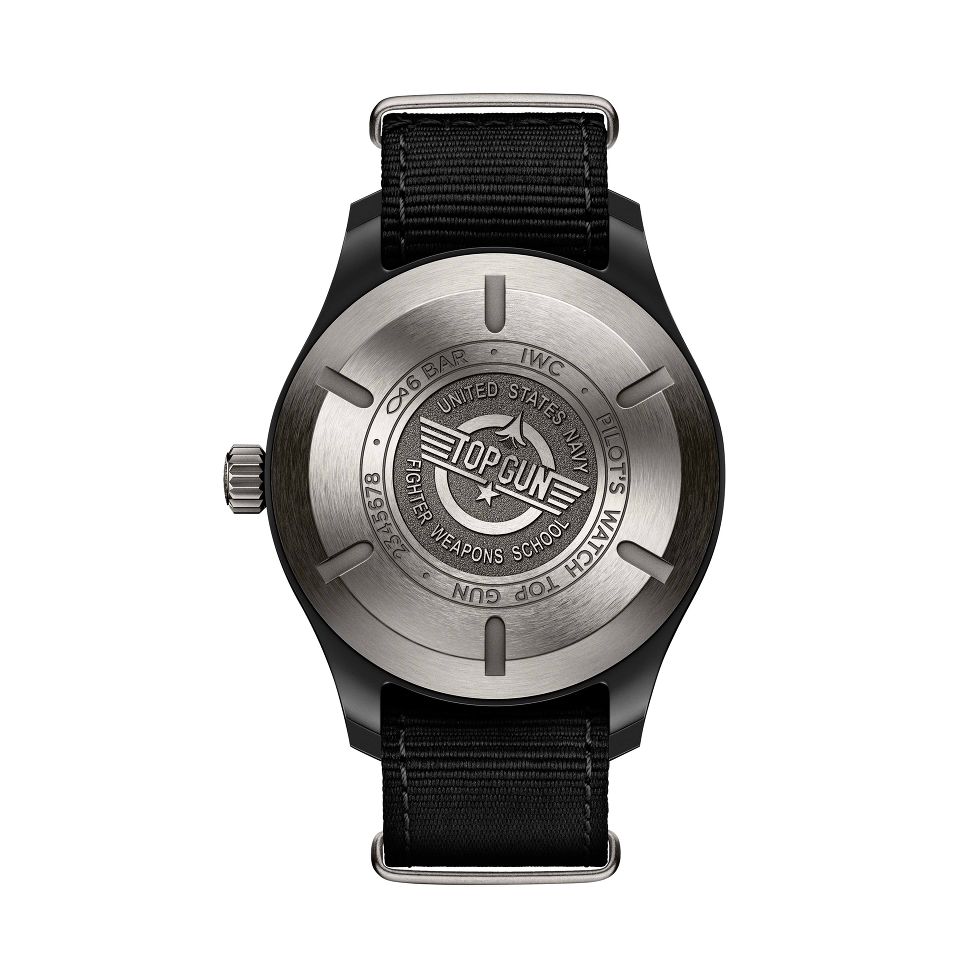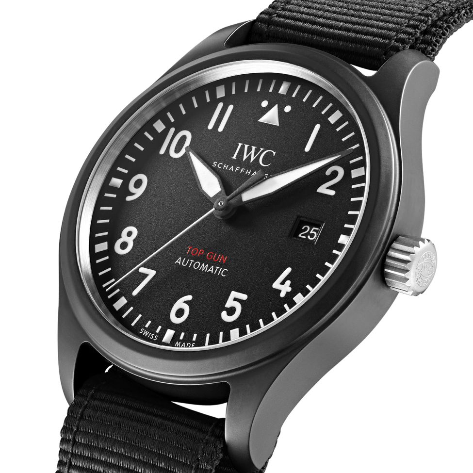 Die IWC Pilot's Watch Automatic TOP GUN zollt den Ausbildern der militärischen Kampffliegerpiloten Tribut. Das schwarze Keramikgehäuse umgibt ein schwarzes Zifferblatt mit Lumineszenz, arabischen Ziffern sowie einer Datumanzeige auf drei Uhr. Der Zeitmesser ist mit dem Kaliber 32110 ausgestattet, dank dem Weicheisen-Innengehäuse ist sie flugtauglich. Die Gravur des TOP GUN Logos schmückt den Gehäuseboden. Ein schwarzes Textilarmband verleiht dem Zeitmesser den letzten Schliff.