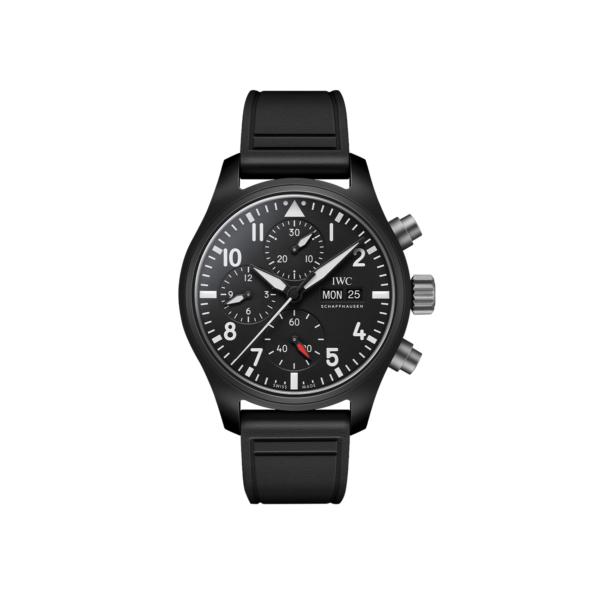 Die IWC Pilot's Watch Chronograph TOP GUN zollt den Ausbildern der militärischen Kampffliegerpiloten Tribut. Das robuste Zirkoniumoxid-Keramikgehäuse schützt die Uhr vor Kratzern und ein Innengehäuse aus Weicheisen schützt das Uhrwerk des Kalibers 69380 vor den Auswirkungen von Magnetfeldern. Das schwarze Zifferblatt ist mit einer Datumanzeige auf drei Uhr sowie drei Anzeigen für die Chronographenfunktionen versehen. Die Gravur des TOP GUN Logos schmückt den Gehäuseboden. Ein schwarzes Kautschukarmband verleiht dem Zeitmesser den letzten.