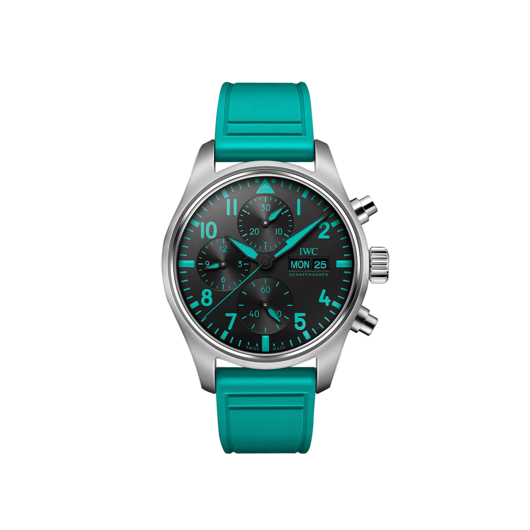 Dieser IWC-Zeitmesser verfügt über ein 41-mm-Titangehäuse, eine kleine Sekunde mit Stoppfunktion, eine Datums- und Tagesanzeige sowie einen Chronographen mit Stunden-, Minuten- und Sekundenanzeige. Angetrieben von dem von IWC hergestellten Automatikwerk 69385 bietet sie eine Gangreserve von 46 Stunden.