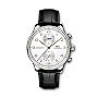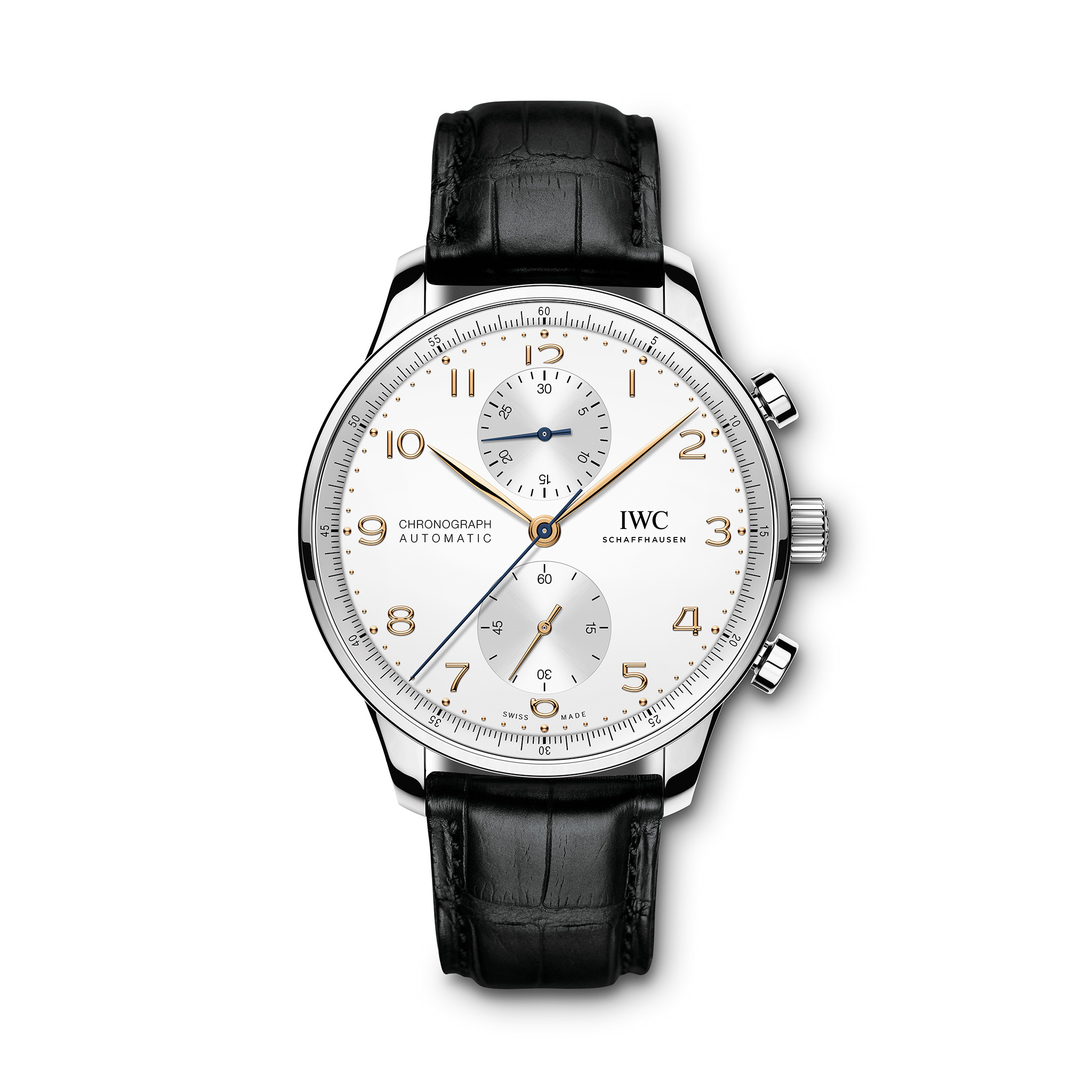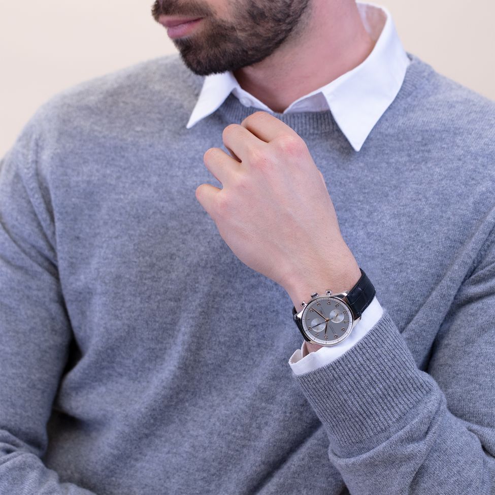 Mit dem 41 mm Portugieser Chronograph rückt IWC Schaffhausen eines der ikonischsten Modelle des Hauses in den Mittelpunkt. Das Edelstahlgehäuse präsentiert das versilberte Zifferblatt mit vergoldeten Arabischen Ziffern und Zeiger, einer kleinen Sekunde mit Stoppvorrichtung sowie die Stoppuhrfunktionen für die Minuten und Sekunden. Das Kaliber 69355, sichtbar durch den Saphirglas-Gehäuseboden, versichert eine Gangreserve von 46 Stunden. Ein schwarzes Alligatorleder Armband rundet den Zeitmesser ab.
