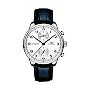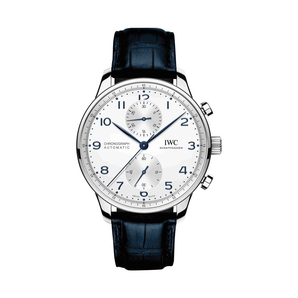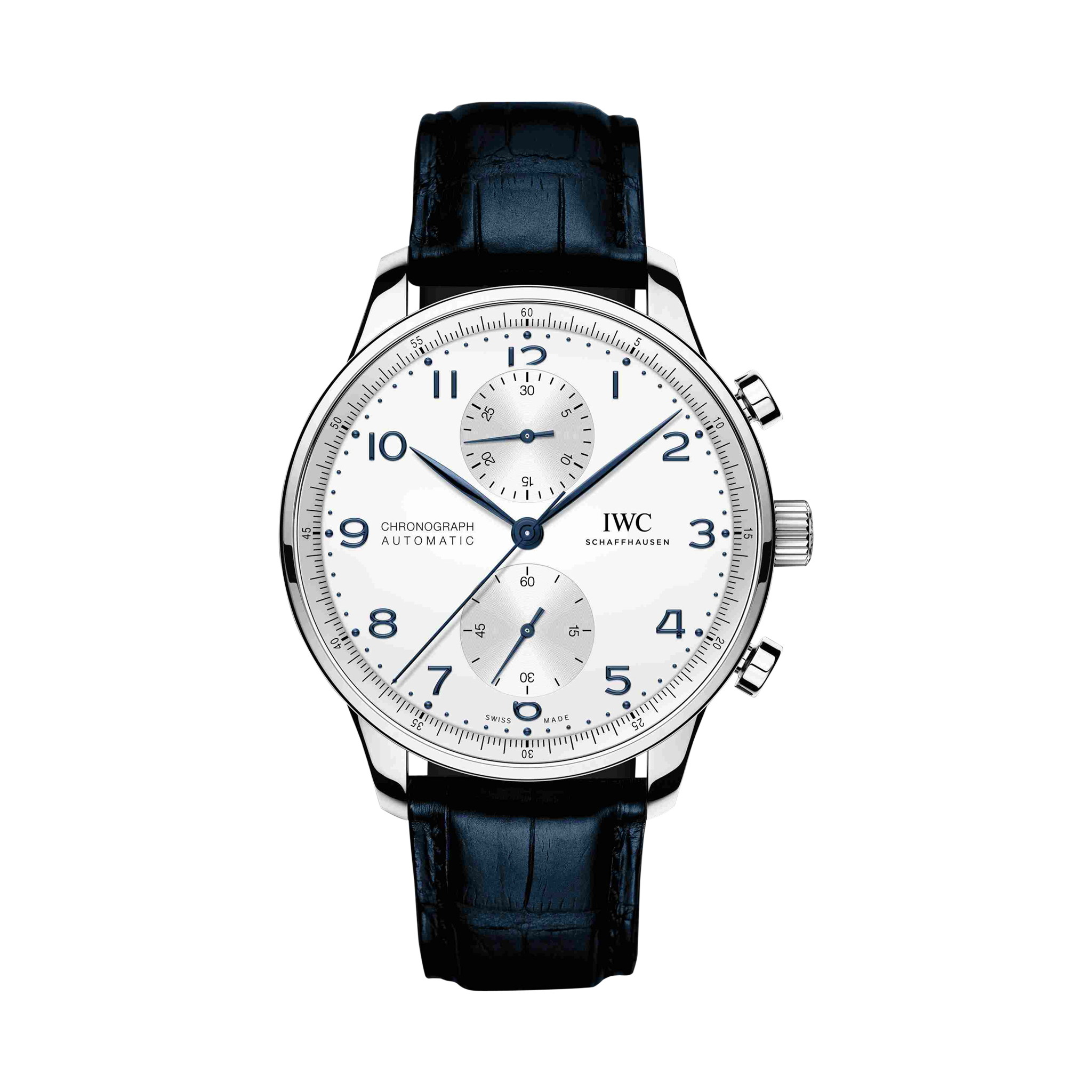 Mit dem Portugieser Chronograph rückt IWC Schaffhausen eines der ikonischsten Modelle des Hauses in den Mittelpunkt. Das 41 mm Edelstahlgehäuse präsentiert das versilberte Zifferblatt mit blauen arabischen Ziffern und Zeiger, einer kleinen Sekunde mit Stoppvorrichtung sowie die Stoppuhrfunktionen für die Minuten und Sekunden. Das Kaliber 69355, sichtbar durch den Saphirglas-Gehäuseboden, versichert eine Gangreserve von 46 Stunden. Ein blaues Alligatorleder Armband rundet den Zeitmesser ab.