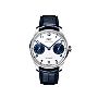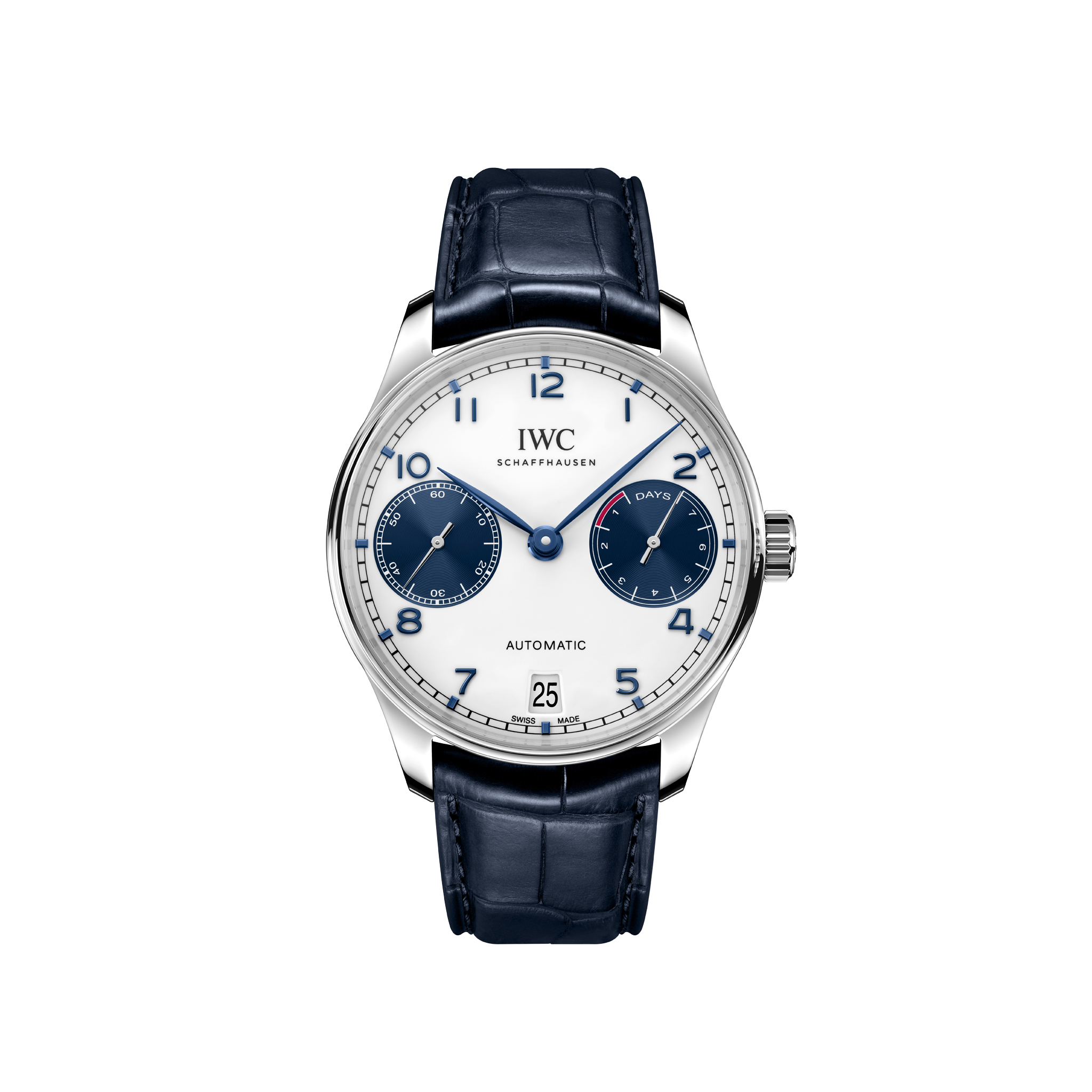 Mit der Portugieser Automatic präsentiert IWC einen unverkennbaren Klassiker. Das 42.3 mm Edelstahlgehäuse umgibt ein weisses Zifferblatt und kontrastierenden blauen Hilfszifferblättern. mit gebläuten Indizes und Zeiger. Die Gangreservenanzeige liegt auf drei, die Datumanzeige auf sechs und die kleine Sekunde auf neun Uhr. Der transparente Gehäuseboden gibt den Blick auf das Kaliber 52010 mit Pellaton-Aufzug frei. Die Uhr verfügt über eine Gangreserve von sieben Tagen, ein blaues Alligator Lederarmband rundet den Zeitmesser ab.