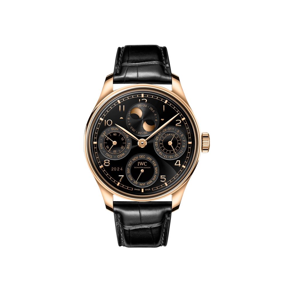 Die IWC Portugieser Perpetual Calendar 44 besticht mit einem Gehäuse aus 18 Karat Armor Gold® und einem eleganten schwarzen Zifferblatt. Das schwarze Alligatorlederarmband von Santoni verleiht der Uhr zusätzlichen Luxus. Mit einem Durchmesser von 44.4 mm und einer Wasserdichtigkeit von 50 Metern kombiniert sie Funktionalität mit Ästhetik. Das Kaliber 52616 bietet eine beeindruckende Gangreserve von 168 Stunden und einen ewigen Kalender mit Anzeigen für Datum, Tag, Monat, Jahr in vier Ziffern und Mondphase.