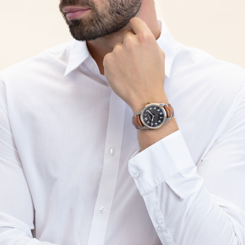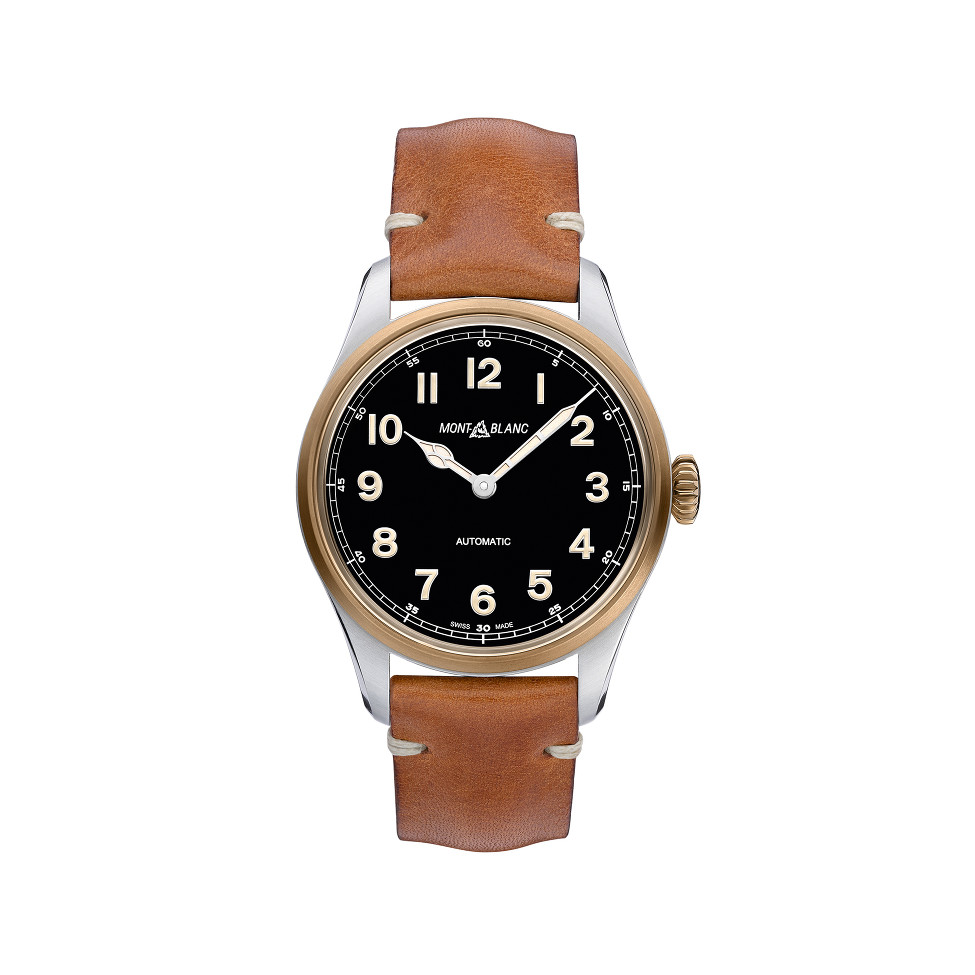 Die Montblanc 1858 Automatic zelebriert den Geist der Entdecker und Piloten der 1930er Jahre in einer vintage-inspirierten Neuinterpretation. Das 40-mm-Edelstahlgehäuse mit bronzefarbener Lünette umgibt ein schwarzes Zifferblatt mit lumineszierende Indizes und Ziffern, sowie rhodinierte Zeiger. Angetrieben vom Kaliber MB 24.15 bietet dieser Automatikzeitmesser eine Gangreserve von 38 Stunden. Ein cognacfarbenes Kalbslederarmband mit einer Dornschliesse aus Edelstahl vervollständigt diese Swiss Made Uhr.
