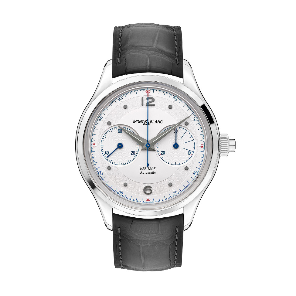 Für die Montblanc Heritage Monopusher Chronograph liess sich die Maison von den eleganten Minerva Klassikern aus den 1940er- und 50er Jahren inspirieren. Das Edelstahlgehäuse präsentiert ein silberweisses Zifferblatt mit zwei Chronographenanzeigen, rhodiumbeschichteten arabischen Ziffern, Indizes und Zeiger sowie einem gebläuten Sekundenzeiger. Das Kaliber MB 25.12 versichert eine Gangreserve von 48 Stunden. Ein graues Alligatorleder Armband mit Faltschliesse rundet den Swiss Made Zeitmesser ab.