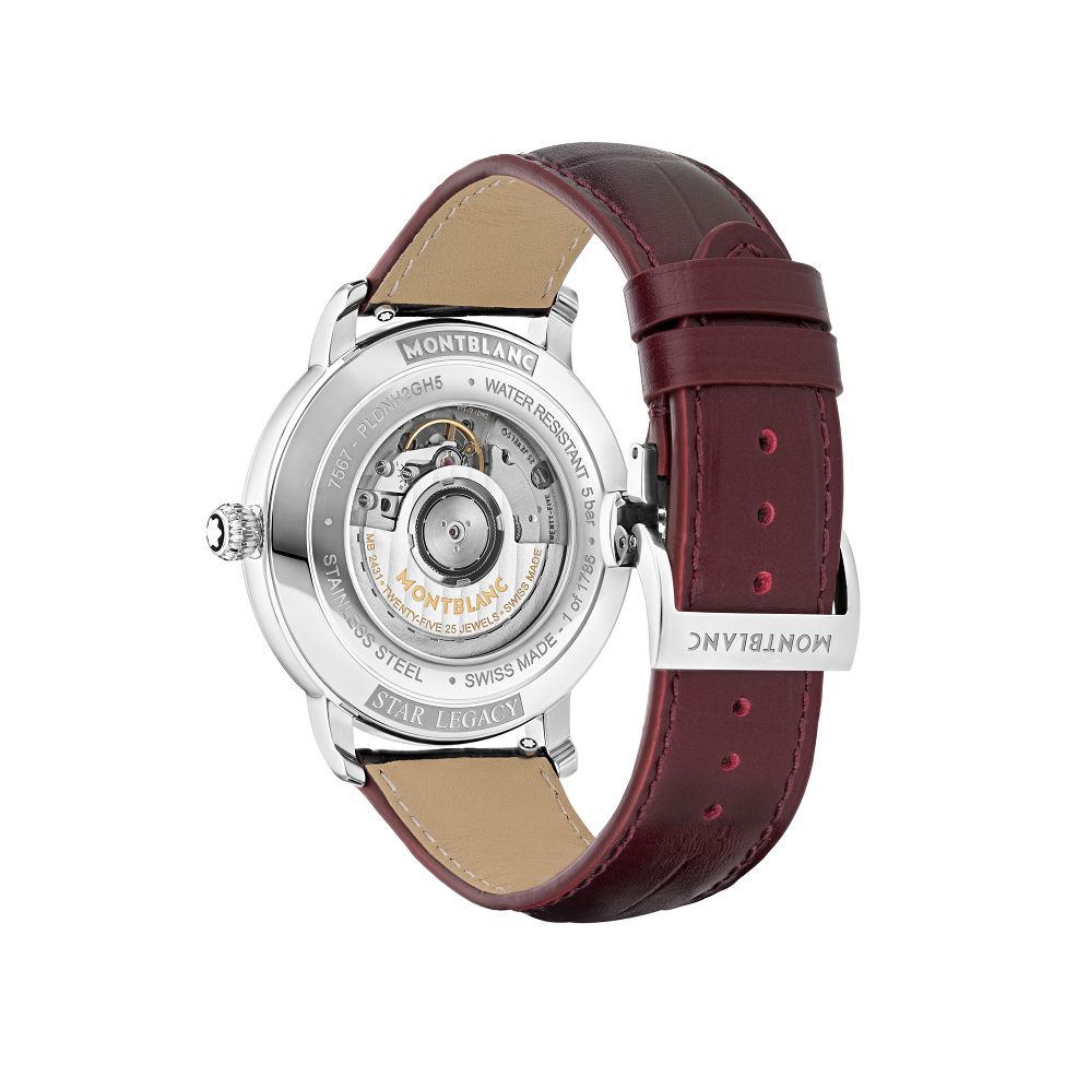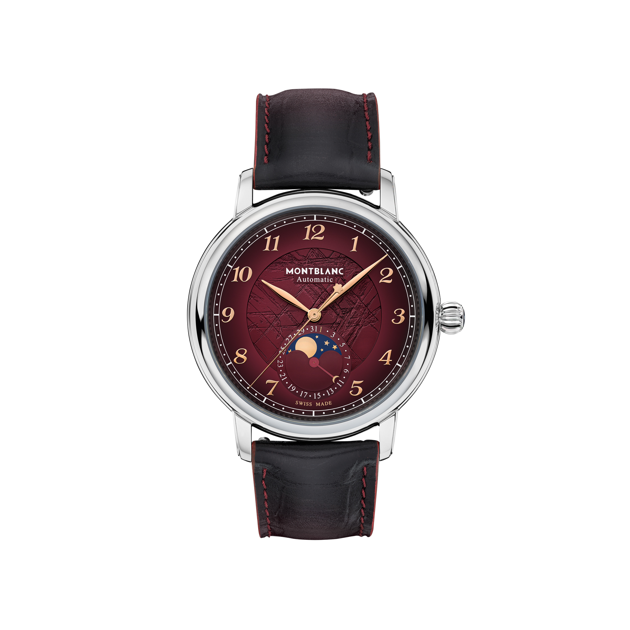 Die Montblanc Star Legacy Moonphase Limited Edition (1786 Stück) ehrt Jacques Balmat, den ersten Besteiger des Mont Blanc. Das burgunderrote Zifferblatt mit Gletschermuster, Sfumato-Effekt und filet sauté wird durch roségoldene Zeiger und Ziffern ergänzt. Die Mondphasenanzeige bei 6 Uhr zeigt Mond und Sterne auf blauem Hintergrund. Das Modell mit MB 24.31 Automatikwerk steckt in einem 42-mm-Edelstahlgehäuse.