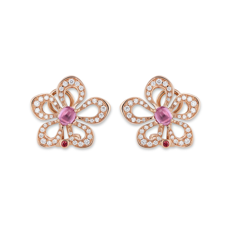Ohrclips aus Roségold mit zwei pinkfarbenen Saphiren im Cabochon-Schliff von zusammen 0.83 ct und 90 Brillanten von zusammen 0.65 ct.