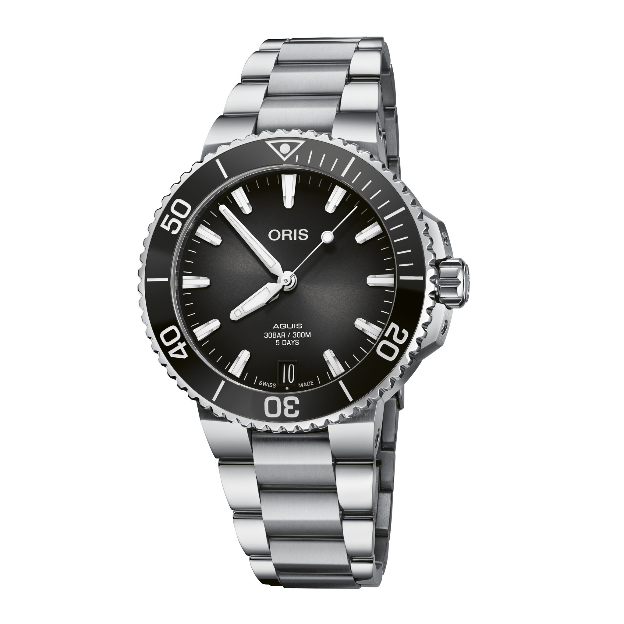 Mit der Aquis Date Calibre 400 lotet Oris die Grenzen mechanischer Uhrmacherei aus. Das 41.5 mm Edelstahlgehäuse verfügt über eine geriffelte schwarzen Keramiklünette. Auf dem schwarzen Zifferblatt mit Datumanzeige sind Indizes und Zeiger mit SuperLuminova beschichtet. Der Zeitmesser wird vom anti-magnetischen und hochpräzisen Automatikwerk Oris 400 angetrieben, welches durch den transparenten Gehäuseboden sichtbar ist. Ein Edelstahl Gliederarmband mit einer Faltschliesse und einer Verlängerung vollendet die Taucheruhr.