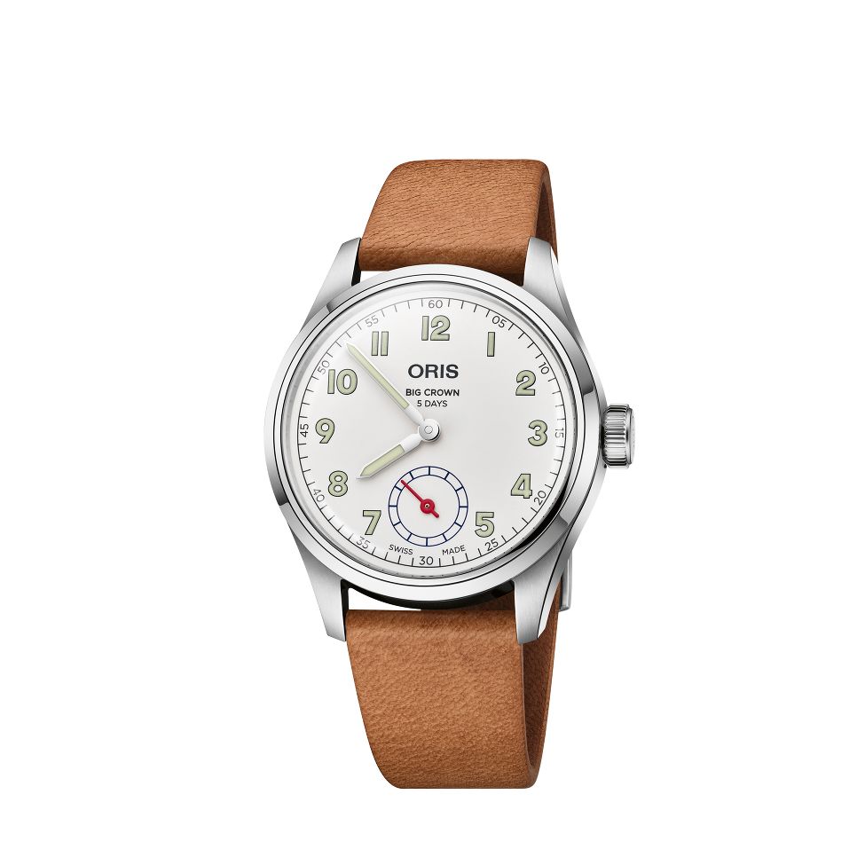 Die Oris Big Crown ist eine limitierte Auflage von 1.000 Stück mit einem 40mm Edelstahlgehäuse, weissem Zifferblatt und 5 Bar Wasserdichtigkeit. Das Herzstück bildet das Kaliber 401 Automatikwerk mit 5 Tagen Gangreserve, hoher Anti-Magnetismus-Fähigkeit und einem Silizium-Hemmungsrad. Die Uhr verfügt über leuchtende Zeiger, Zahlenindizes und eine kleine Sekunde bei 6 Uhr.