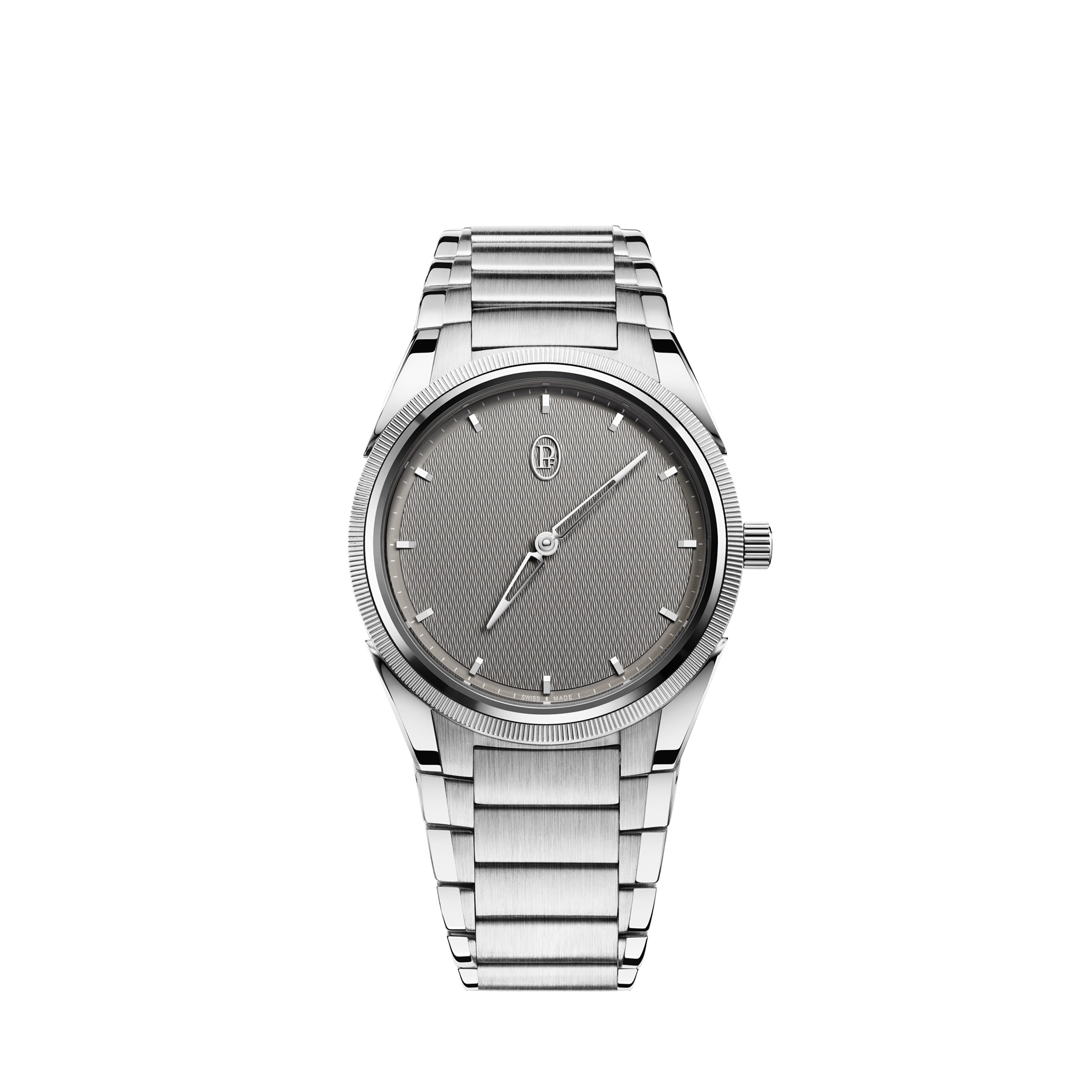 Mit der Tonda PF Automatic präsentiert Parmigiani Fleurier einen Zeitmesser von erlesener Ästhetik. Das polierte und satinierte Edelstahlgehäuse mit von Hand kannelierter Lünette umgibt das silberne Zifferblatt mit Grain d'Orge Guillochierung, deltaförmigen Zeigern und Hand applizierten Indizes, die mit 12 Baguette-Diamanten besetzt sind. Die Uhr wird vom Automatikwerk PF770 angetrieben, das eine Gangreserve von 60 Stunden bietet und durch den transparenten Gehäuseboden sichtbar ist. Ein polierter und satinierter Edelstahlarmband mit Faltschliesse verleiht der Uhr den letzten Schliff.