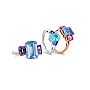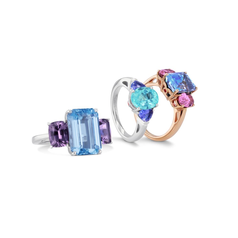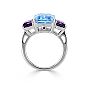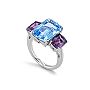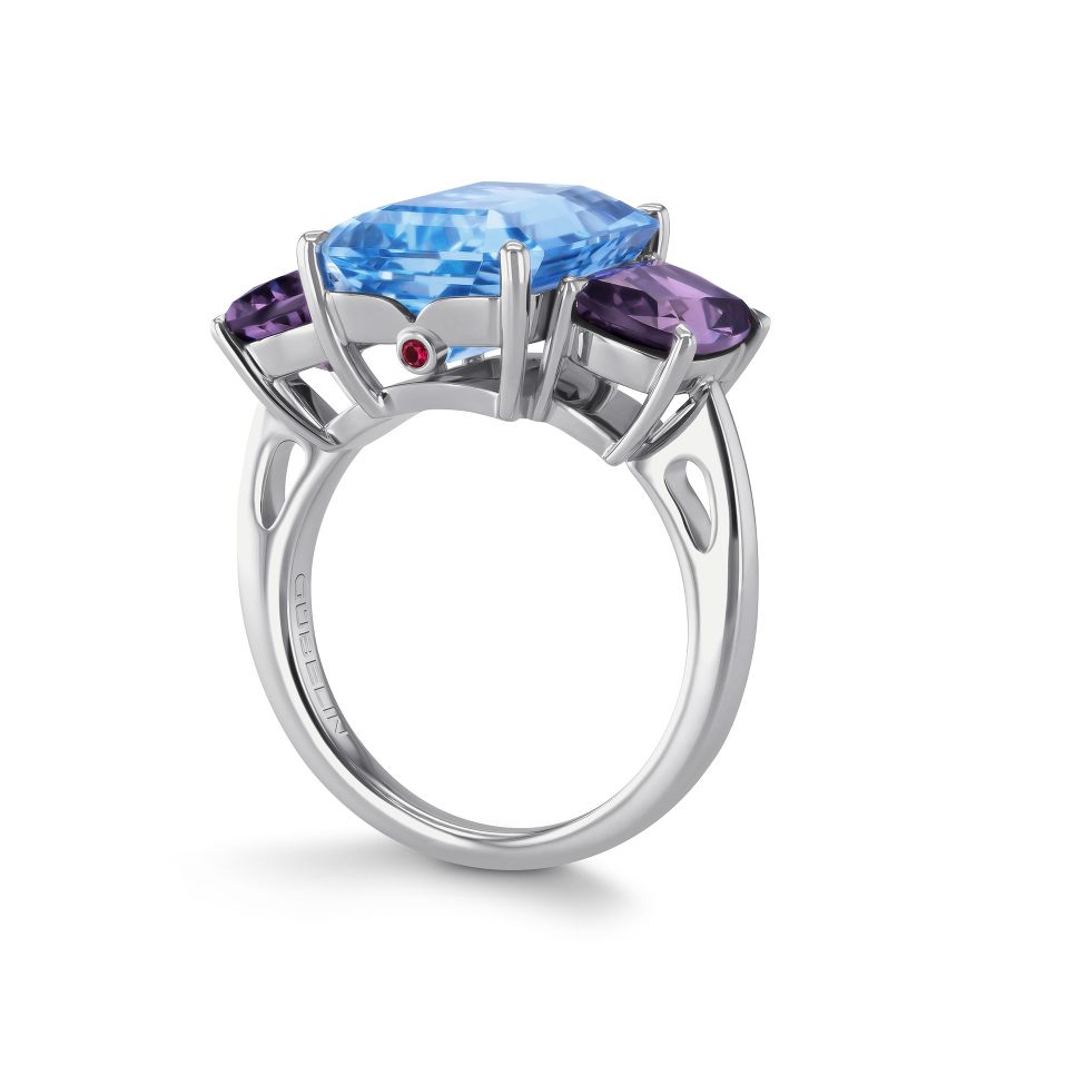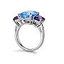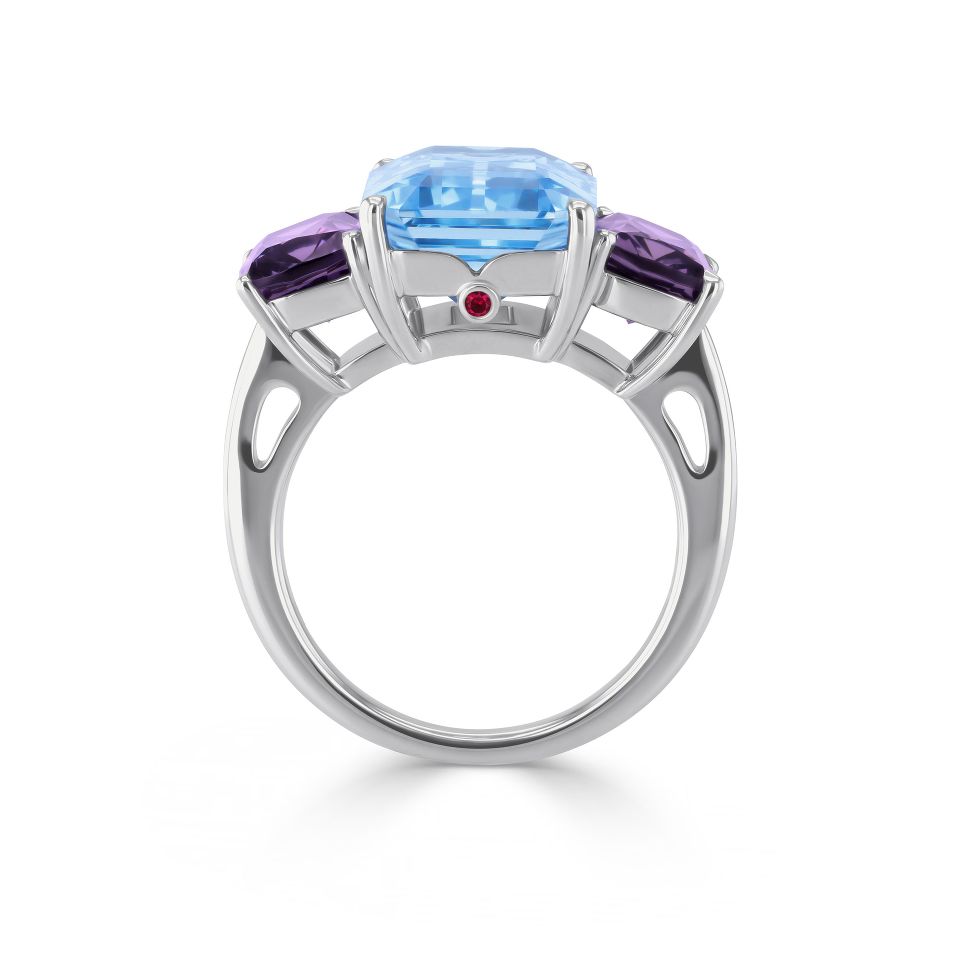 Ring aus Weissgold mit einem Aquamarin von 6.37 ct und zwei violetten Spinellen von zusammen 3.50 ct.