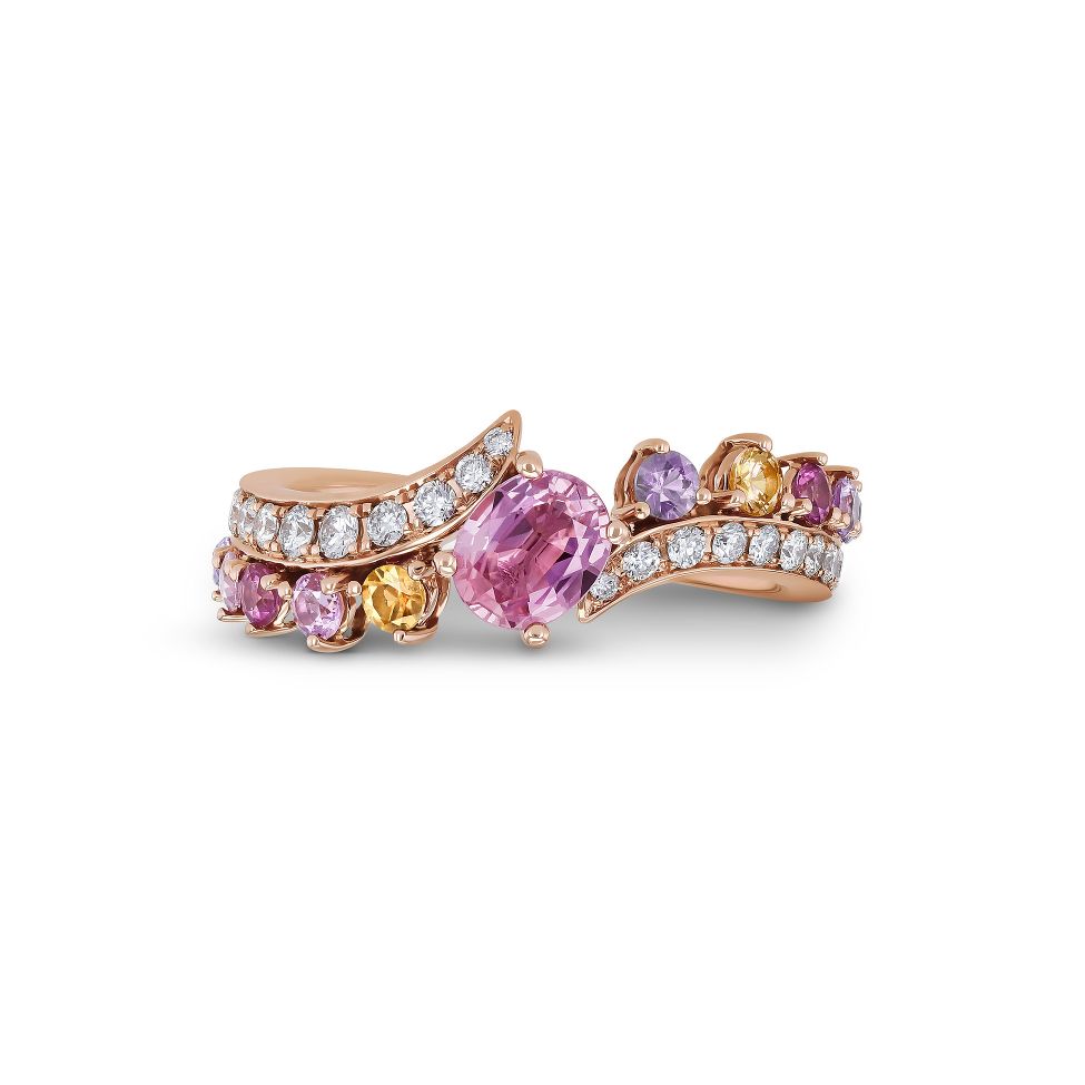 Ring aus Rotgold mit einem pinken ovalen Saphir von 0.53 ct, 12 pink-orangenen runden Saphiren von zusammen 0.61 ct sowie 24 Brillanten von zusammen 0.30 ct.