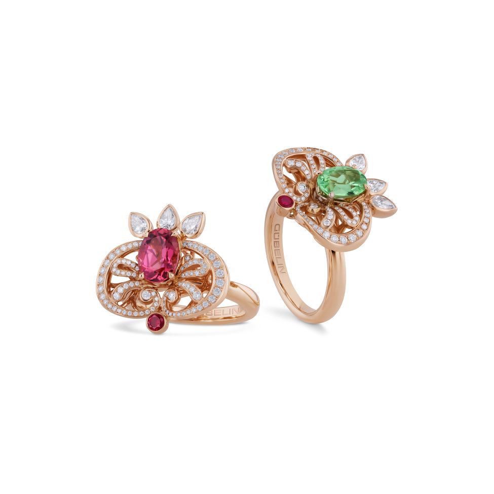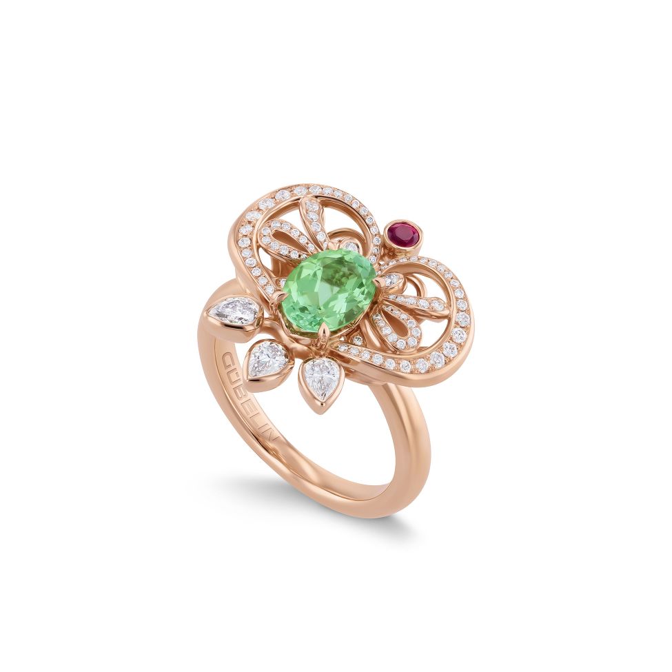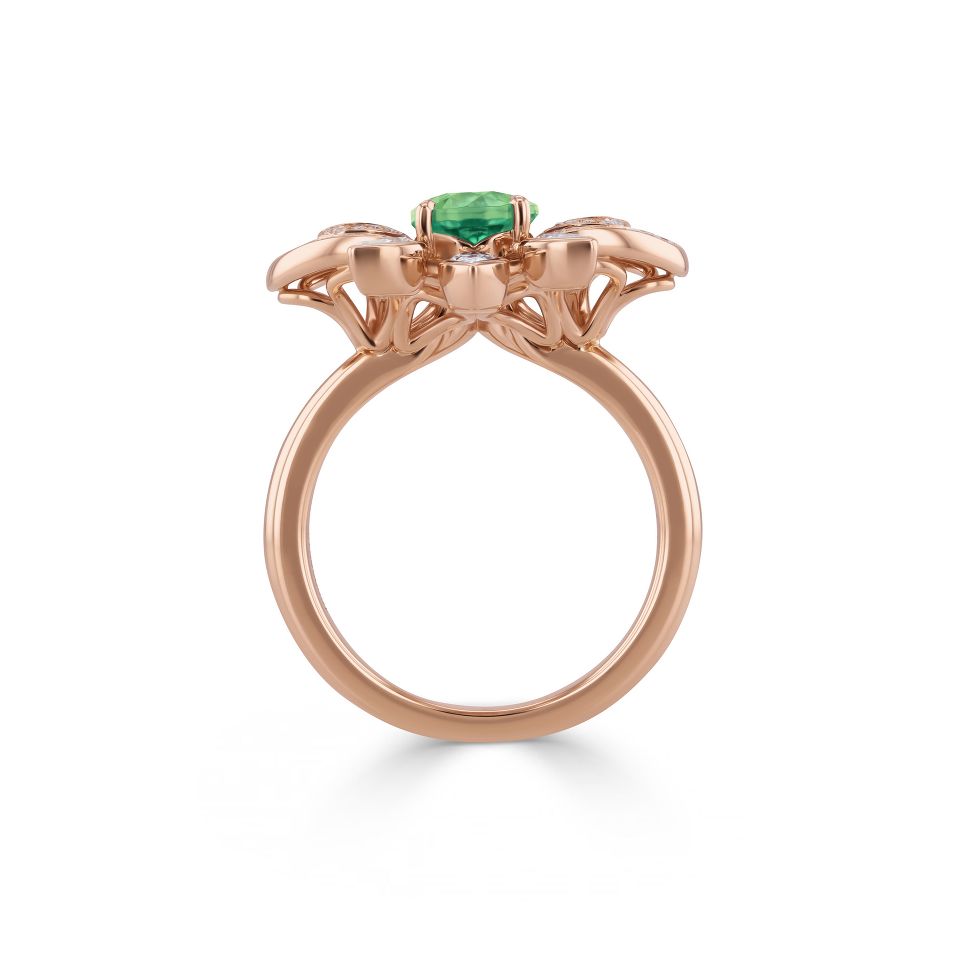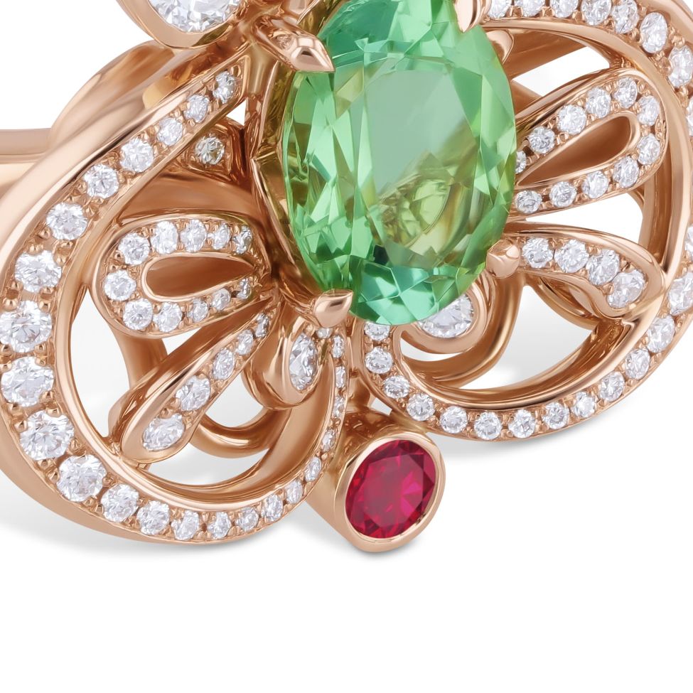 Ring aus Roségold mit einem mintfarbenen Turmalin in ovalem Schliff von 1.21 ct, 84 Brillanten von zusammen 0.20 ct und 3 tropfenförmigen Diamanten von zusammen 0.27 ct.