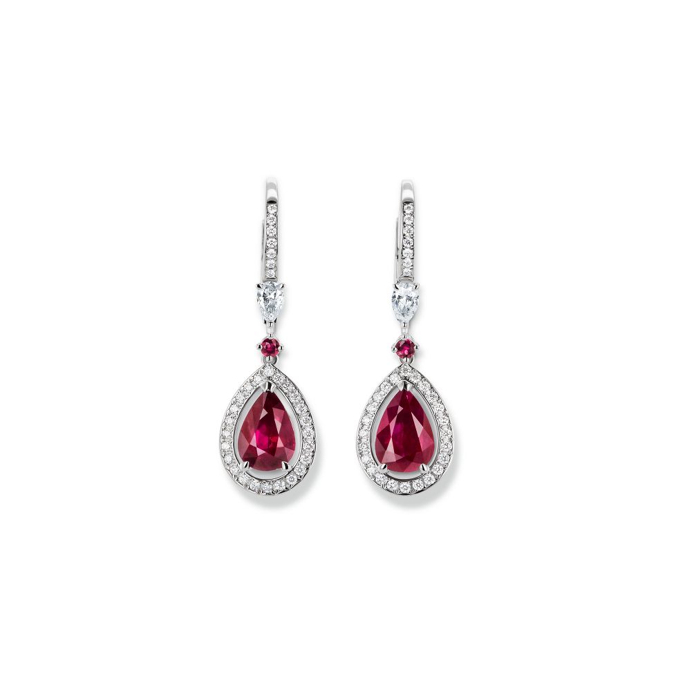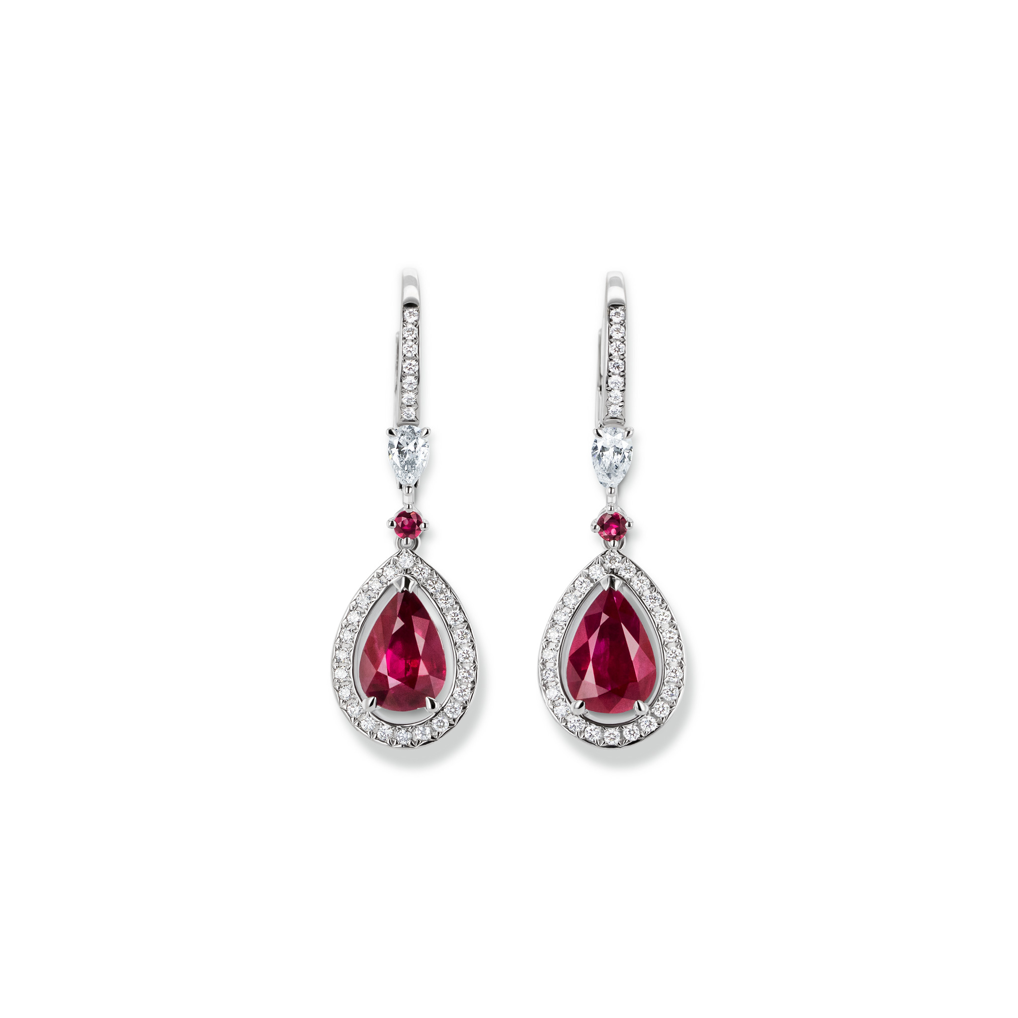 Ohrhänger aus Weissgold mit zwei tropfenförmigen Rubinen aus Burma von 1.19 ct und 0.99 ct sowie zwei tropfenförmigen Diamanten und 62 Brillanten von zusammen 0.45 ct.