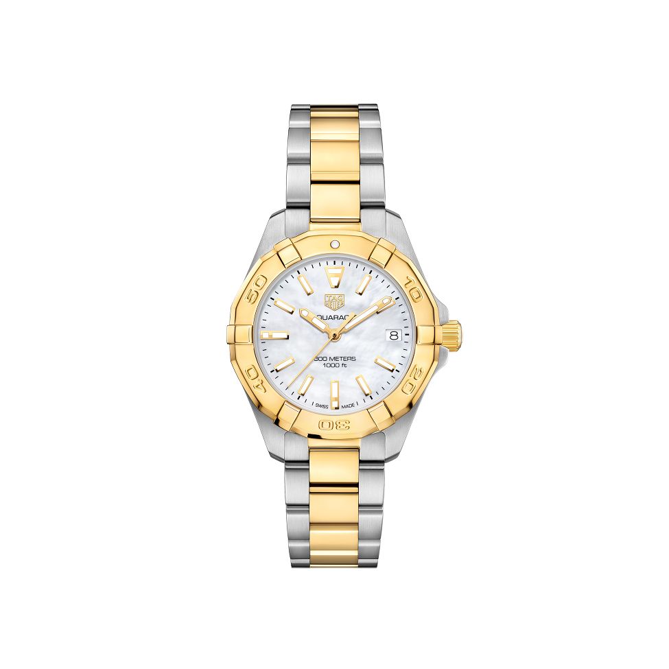 Die TAG Heuer Aquaracer vereint sportliche Taucher-Aesthetik mit edler Bicolor-Note. Gehaeuse und Band kombinieren Edelstahl mit 750er Gelbgold und bieten Robustheit sowie angenehmen Tragekomfort. Ein praezises Quarzwerk sorgt fuer sorglose Zeitmessung. Markante, gut greifbare Luenette, klare Zeiger und leuchtstarke Indizes ermoeglichen schnelle Ablesbarkeit.