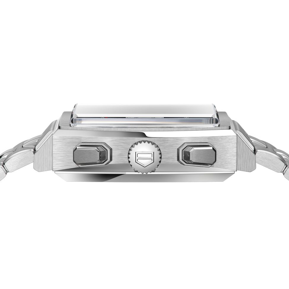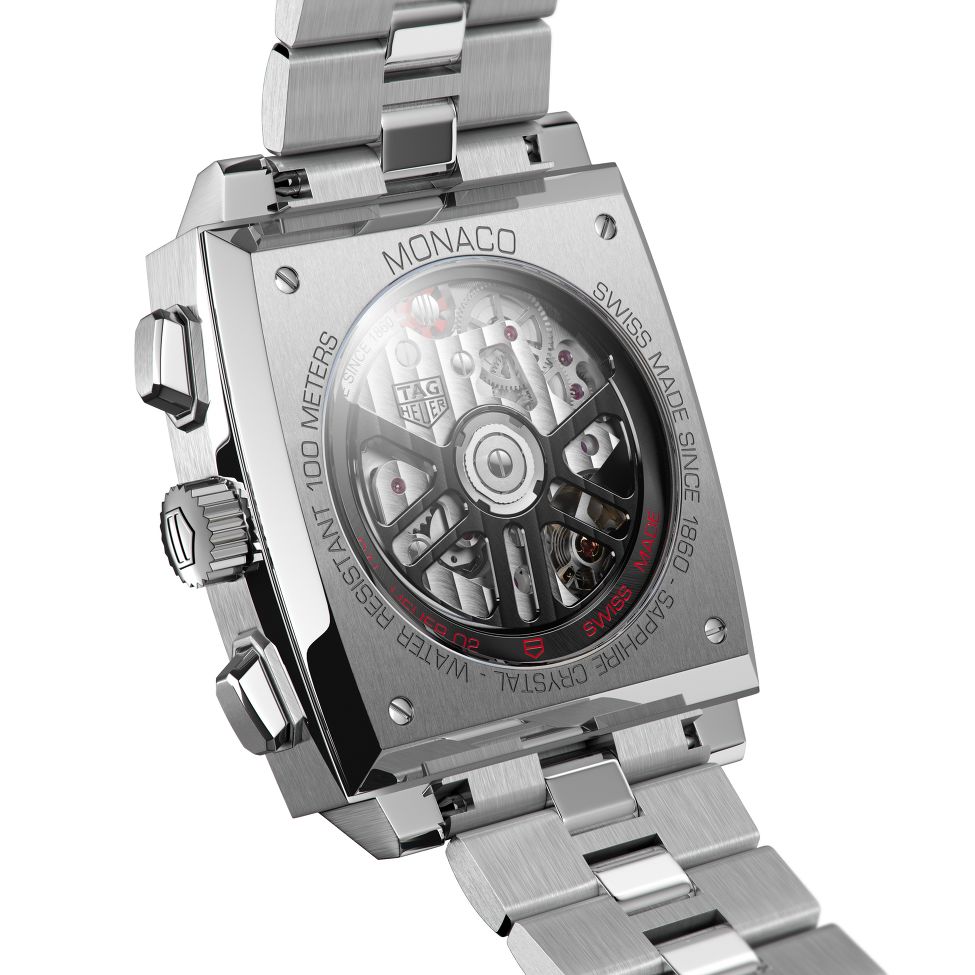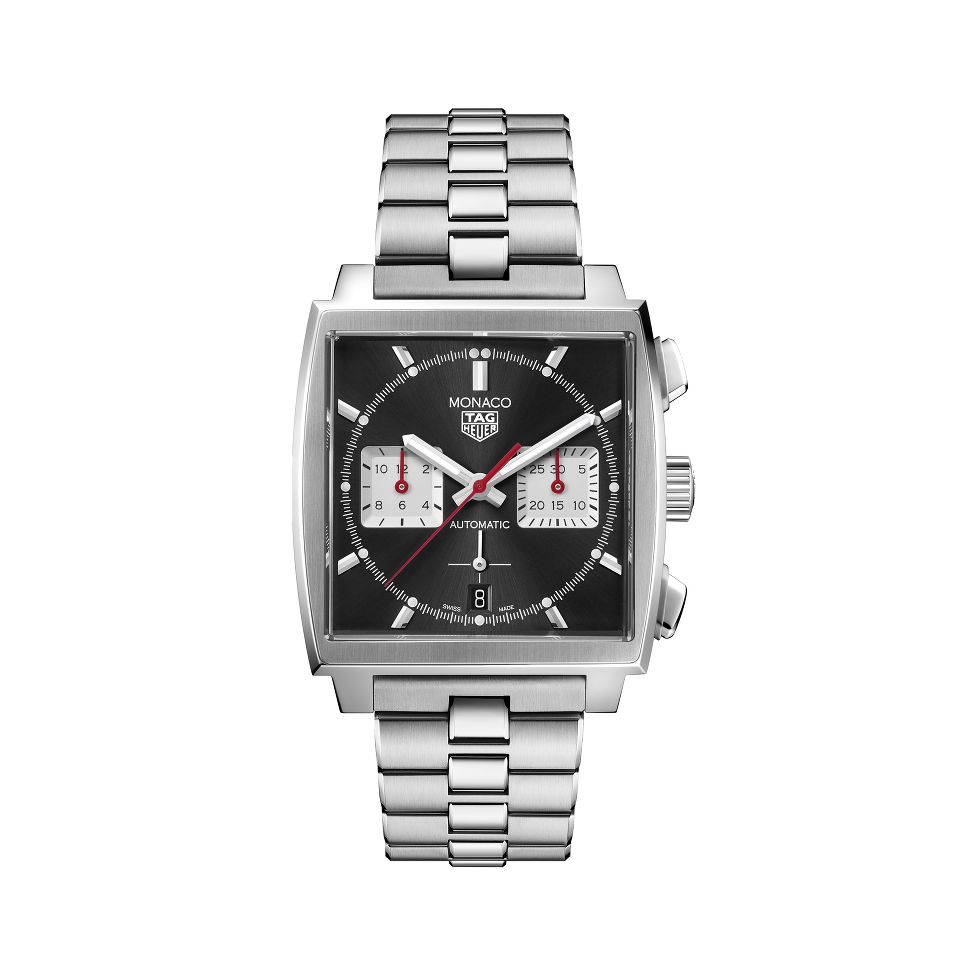 Das Design des legendären TAG Heuer Monaco Chronograph von 1969 gilt als erster quadratischer Automatik-Chronograph. Umgeben von einem Gehäuse in poliertem und gebürstetem Edelstahl, präsentiert das schwarze Zifferblatt mit Sonnenschliff polierte, facettierte Indizes, Chronographenanzeigen sowie eine Datumanzeige. Der transparente Gehäuseboden ermöglicht den Blick auf das Automatikkaliber HEUER 02. Ein Edelstahl Gliederarmband mit einer Faltschliesse verleiht den letzten Schliff.