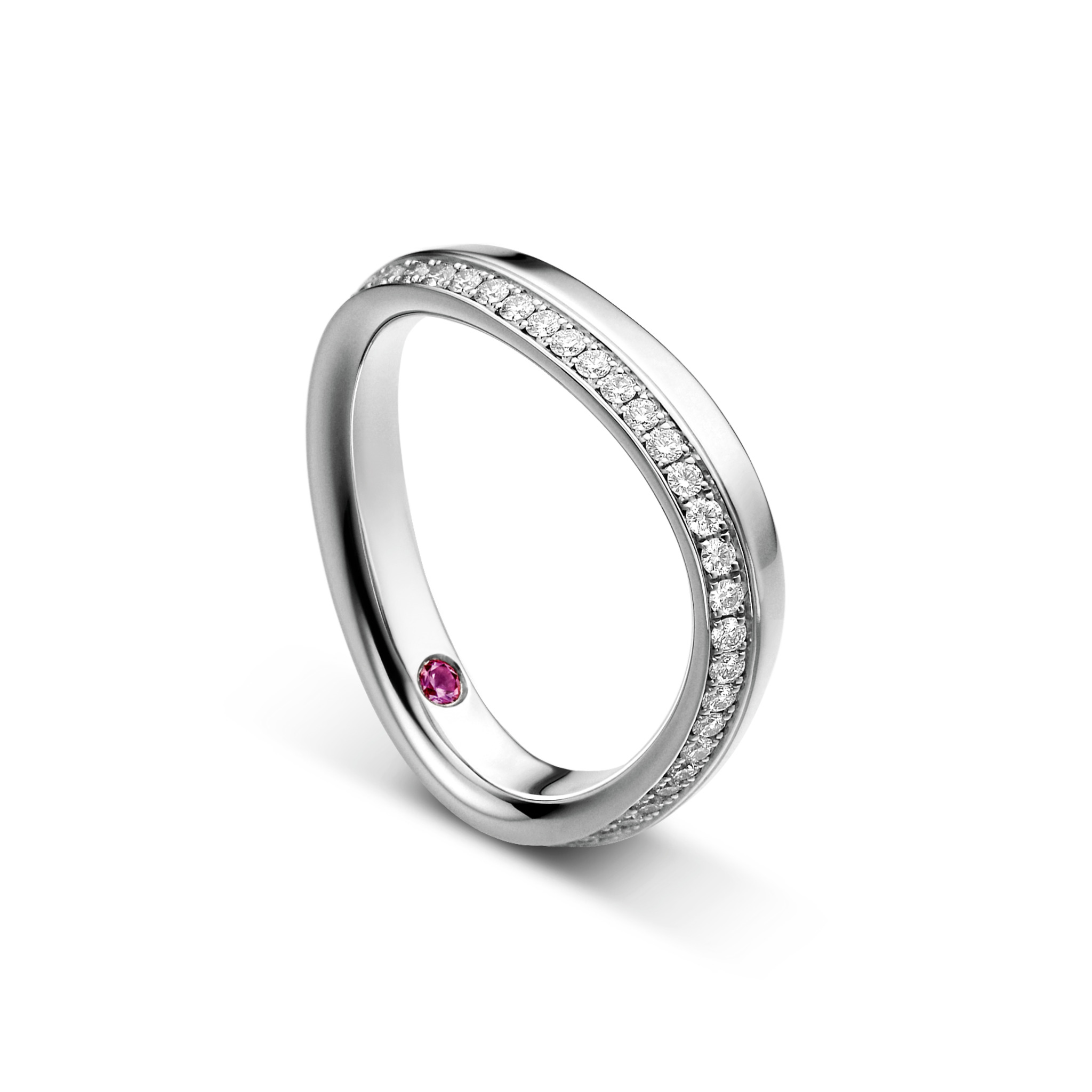 Herzförmiger Trauring aus Weissgold mit Brillanten.