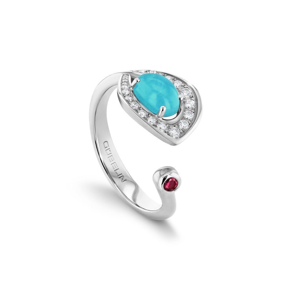 Weissgoldring mit einem blauen Paraiba-Turmalin im Cabochon-Schliff von 0.85 ct sowie 24 Brillanten von zusammen 0.26 ct.