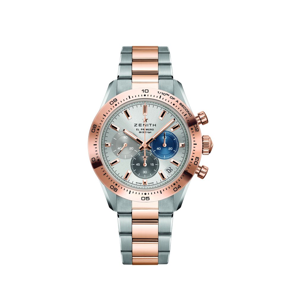 Die Chronomaster Sport präsentiert sich in zeitgemässem, unverkennbaren Zenith Design und misst die verstrichene Zeit auf die Zehntelsekunde genau. Das Edelstahlgehäuse mit Roségold Lünette umgibt das silberne Zifferblatt mit drei individuell gefärbten Chronographenanzeigen, die von einer Datumanzeige ergänzt werden. Der transparente Gehäuseboden präsentiert die neuste Generation des Kalibers El Primero 3600. Ein Roségold und Edelstah Gliederarmband rundet den Zeitmesser ab.