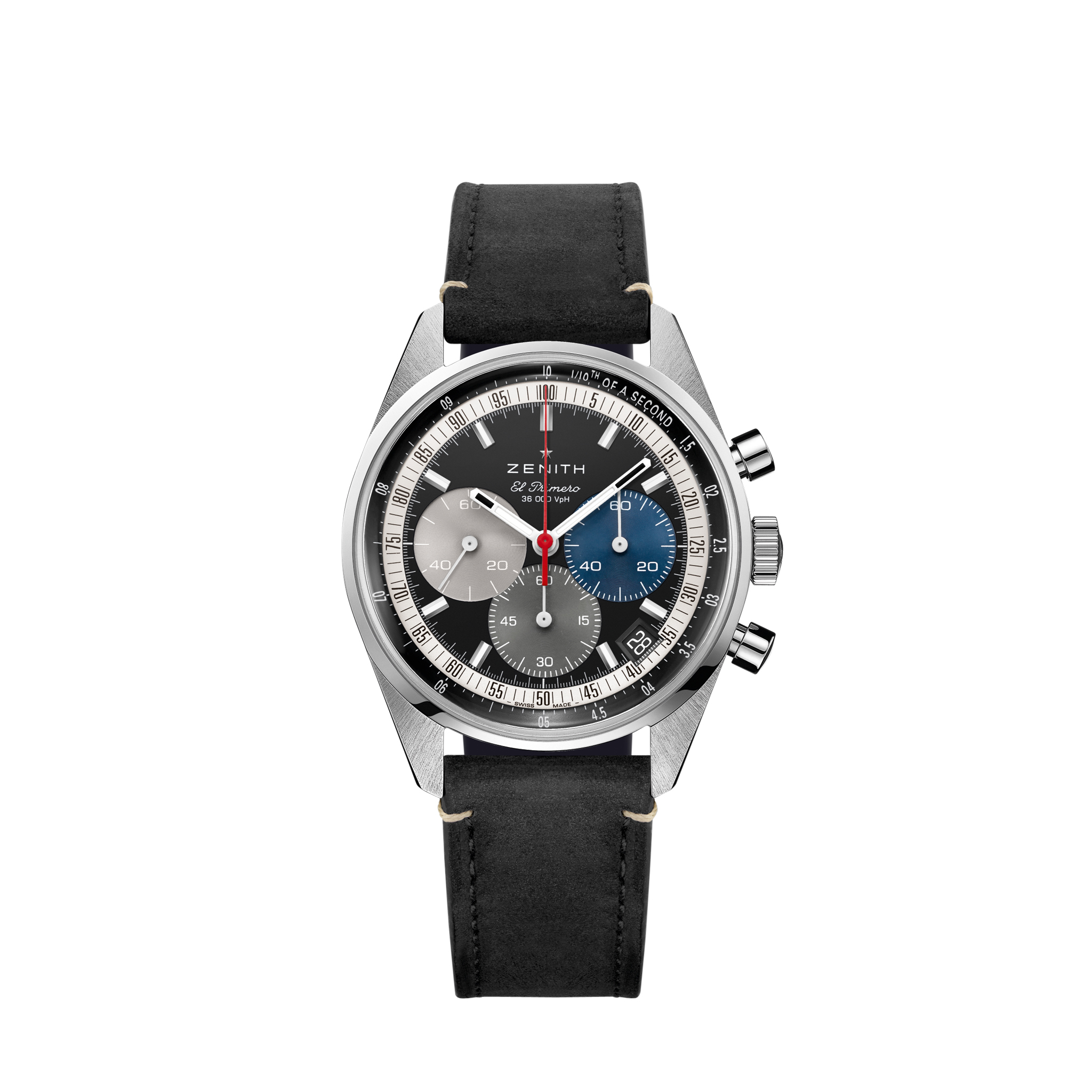 Mit dem Chronomaster Original illustriert Zenith das Savoir-faire der Manufaktur auf dem Gebiet der Hochfrequenz-Chronographen und einer seit über 50 Jahren etablierten Designsprache. Das Edelstahlgehäuse präsentiert das matte schwarze Zifferblatt mit farblich abgesetzten Chronographenanzeigen und einer Datumanzeige. Der Gehäuseboden ermöglicht einen Blick auf das El Primero 3600 Schaltrad-Chronographenwerk mit Automatikaufzug. Ein schwarzes Kalbslederarmband mit Faltschliesse rundet den Zeitmesser ab.