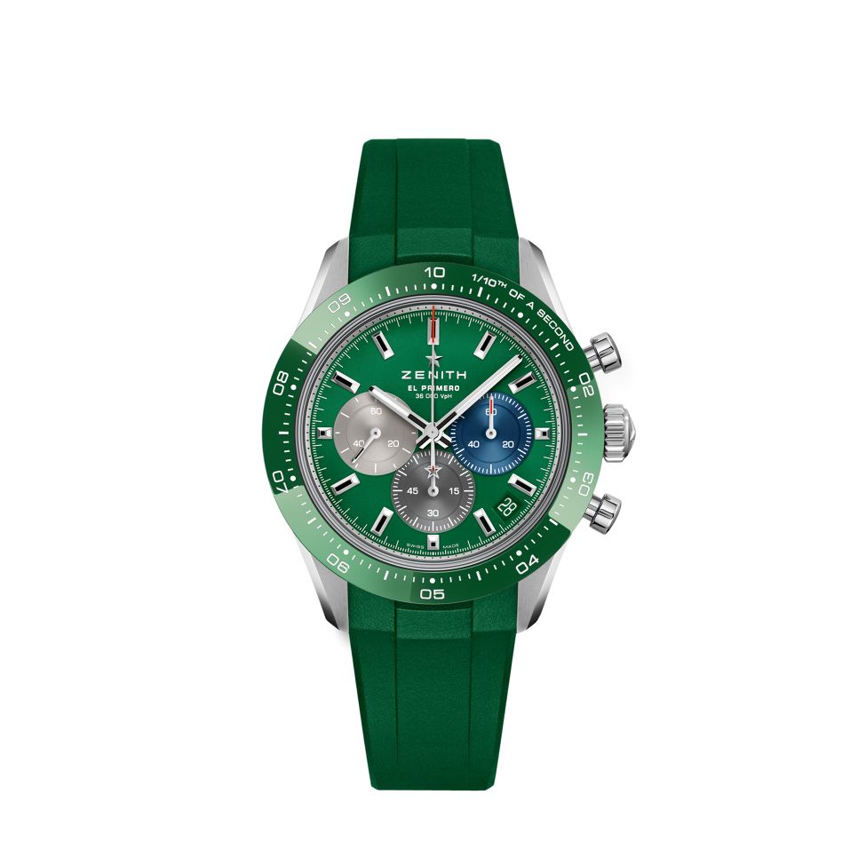 Der Zenith Chronomaster Sport vereint sportliche Eleganz und technische Präzision in einem 41 mm Edelstahlgehäuse mit grüner Keramiklünette. Das grüne, lackierte Zifferblatt mit Tricolor-Design ist an ein grünes Kautschukarmband gekoppelt, das einen modernen und aktiven Lebensstil unterstreicht. Angetrieben wird diese Uhr durch das hochfrequente El Primero 3600 Automatikwerk, das eine Chronographenfunktion mit 1/10-Sekunden-Genauigkeit bietet und eine Gangreserve von 60 Stunden aufweist.
