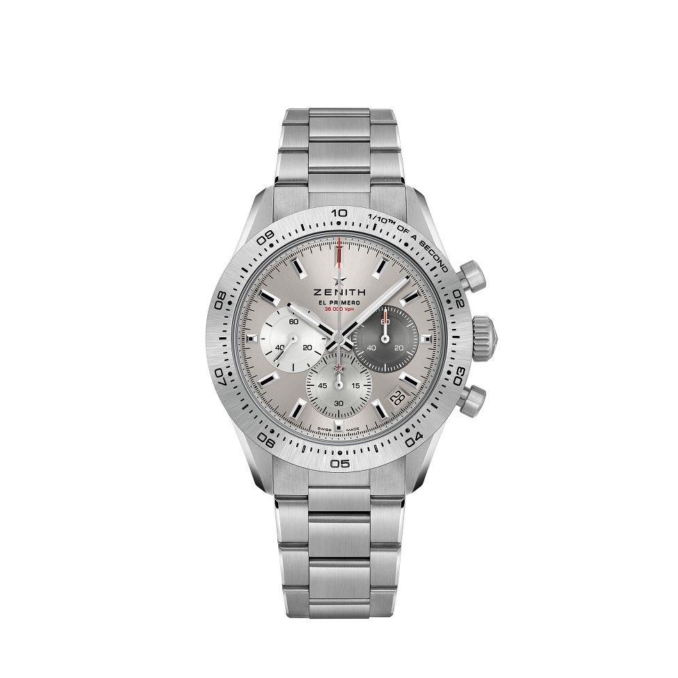 Die CHRONOMASTER Sport von ZENITH besticht durch ein 41mm Titangehäuse mit einer gebürsteten Titanlünette und einem nickelgrauen, dreifarbigen Zifferblatt mit Sonnenschliff. Angetrieben von dem automatischen Hochfrequenz-Chronographenwerk El Primero 3600 mit 1/10-Sekunden-Chronographenfunktion und einer Gangreserve von 60 Stunden. Diese Uhr ist wasserdicht bis 100 Meter und wird mit einem Titanarmband geliefert.