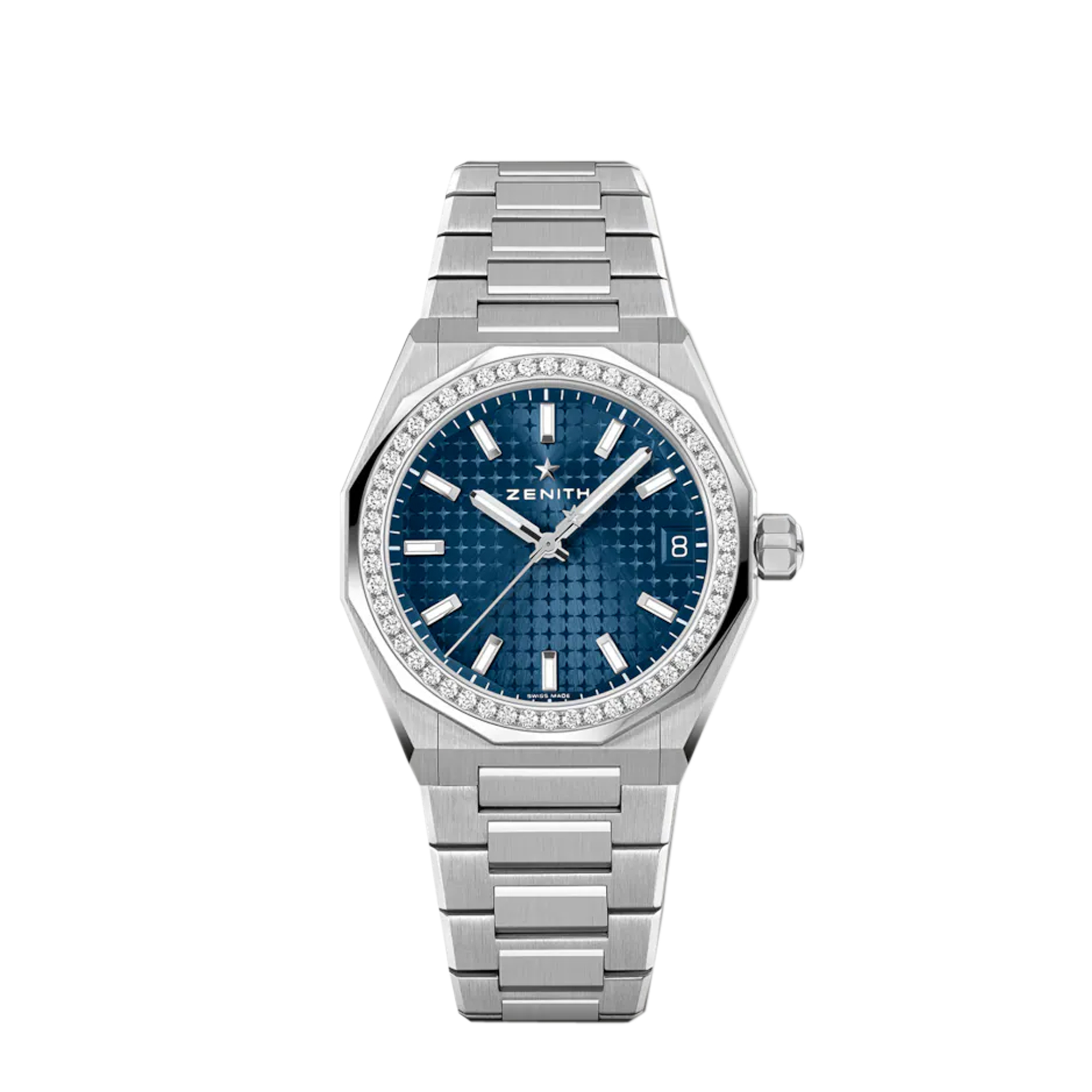 Die DEFY Skyline präsentiert sich in einer neuen Grösse, neuen Farben und in der unverwechselbaren Silhouette. Mit dem Edelstahlgehäuse in der neuen 36 MM Version und diamantbesetzter Lünette bietet ZENITH Unisex-Proportionen für die kantige Uhr an, für diejenigen, die kleinere Grössen bevorzugen. Das Zifferblatt in Blau mit Sonnenschliff greift den emblematischen ZENITH-Stern auf und wird durch eine Datumsanzeige bei drei Uhr ergänzt. Die rhodinierten Zeiger und Indizes sind mit Super-LumiNova® versehen. Der transparente Gehäuseboden präsentiert das ELITE 670 Automatikwerk mit einer sternförmigen Schwungmasse und satinierten Verzierungen. Ein austauschbares Edelstahl Gliederarbamd rundet den Zeitmesser ab.