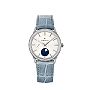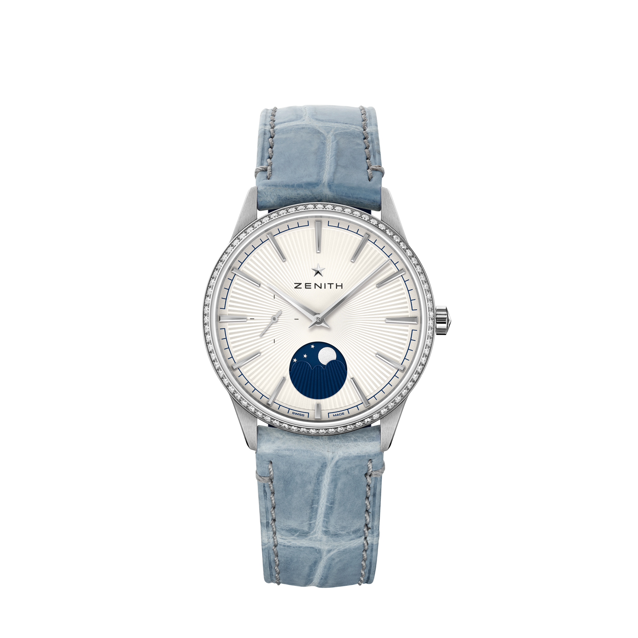 Mit Elite gelingt es Zenith eine harmonische Asymmetrie in bezaubernder Schönheit zu präsentieren. Das 36 mm Edelstahlgehäuse mit diamantenbesetzter Lünette umgibt ein silbernes Zifferblatt mit Soleil-Guillochierung mit einer Mondphasenanzeige auf sechs Uhr. Die vergoldeten Stundenindizes sind facettiert, die kleine Sekunde liegt auf neun Uhr. Der transparente Gehäuseboden ermöglicht den Blick auf das Elite Automatikwerk. Ein jeansblaues Alligatorleder Armband mit einer Dornschliesse rundet diese Uhr ab.