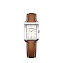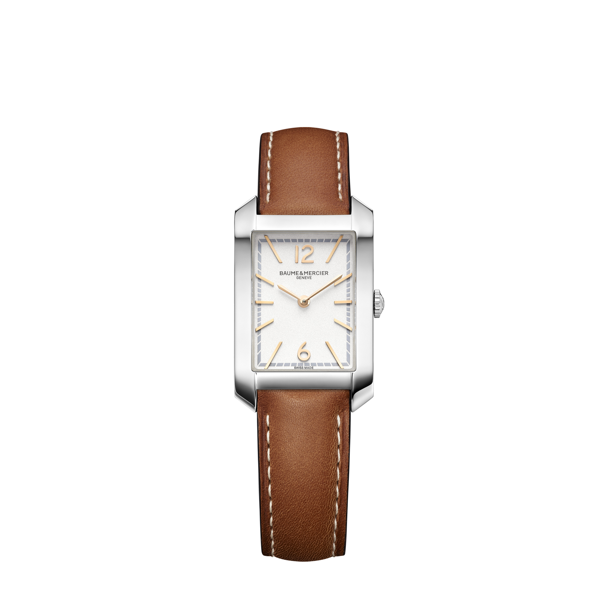 With the sleek rectangular Hampton watches, presents Baume & Mercier an elegant and sophisticated collection. The stainless steel case houses the pure silver-coloured dial, which is adorned with gilt Arabic numerals and gilt sword-shaped hands. The timepiece is powered by a Swiss Made quartz movement. A brown calfskin strap with beige stitching adds the finishing touch.