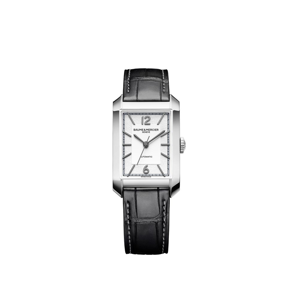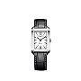 This watch is a 43 x 27.5 mm automatic watch that balances urbane style with watchmaking excellence. It features 21 jewels and a 38-hour power reserve. The sleek rectangular stainless steel case is complemented by an opaline and grained silver-colored dial.
