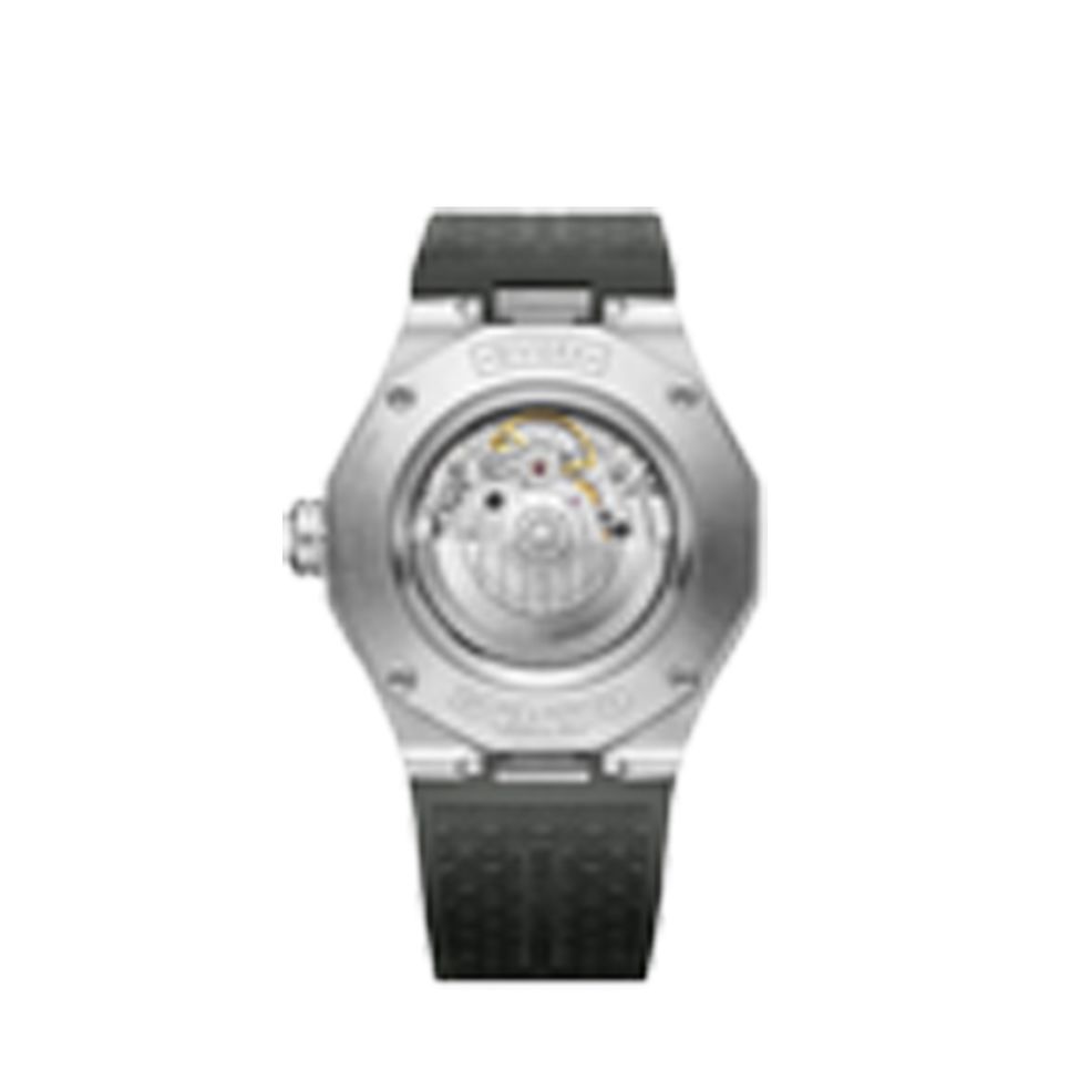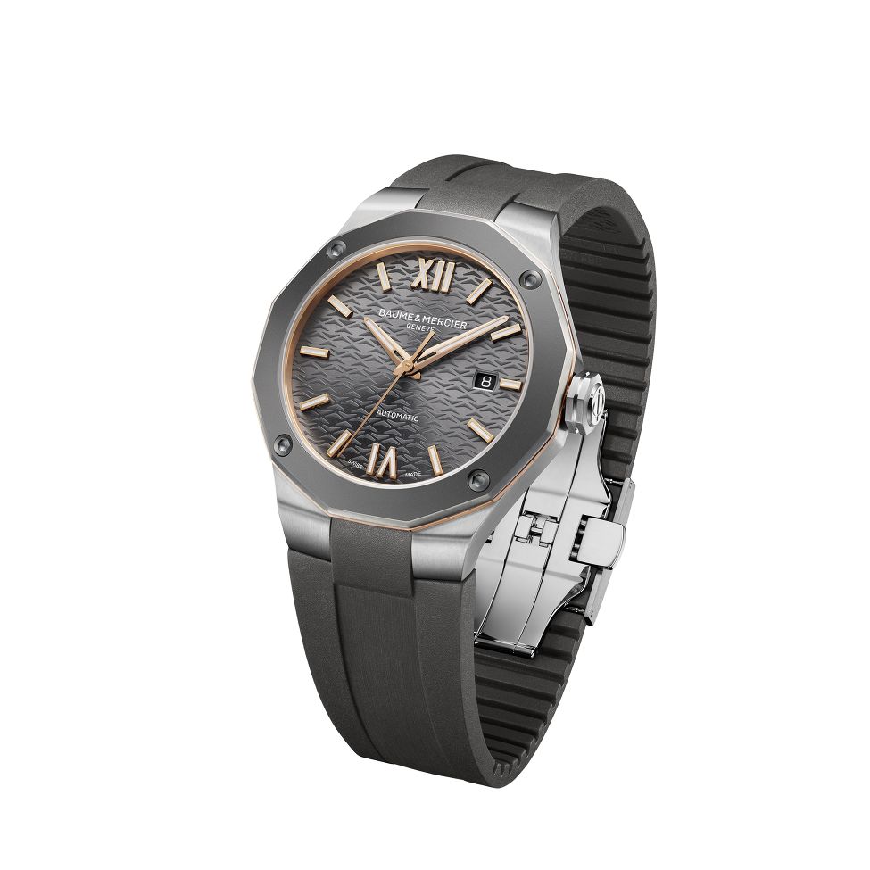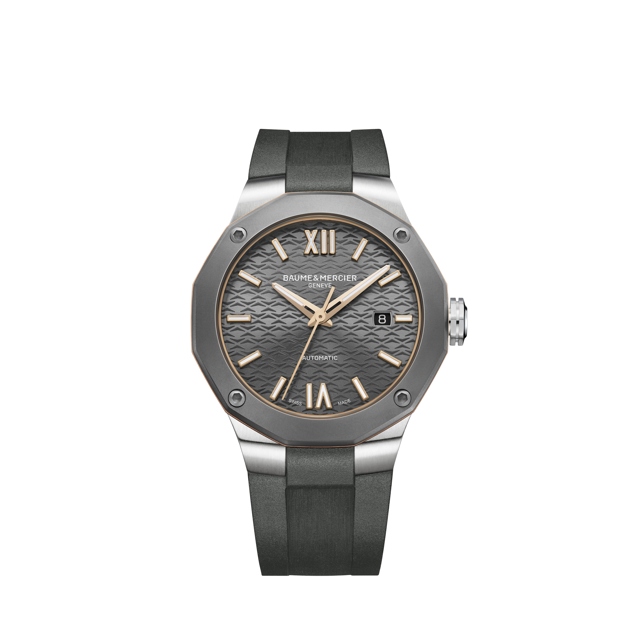 With the Riviera Baume & Mercier presents a subtle combination of a refined and sporty look. The stainless steel case is fitted with a twelve-sided titanium bezel. On the grey patterned dial, Roman numerals and gilt dauphine hands complement the date aperture. The transparent case back reveals the self-winding automatic movement of this timepiece, which offers a water resistance of 100 metres. A grey rubber strap with a triple folding clasp and fast strap system adds the finishing touch.