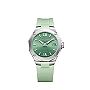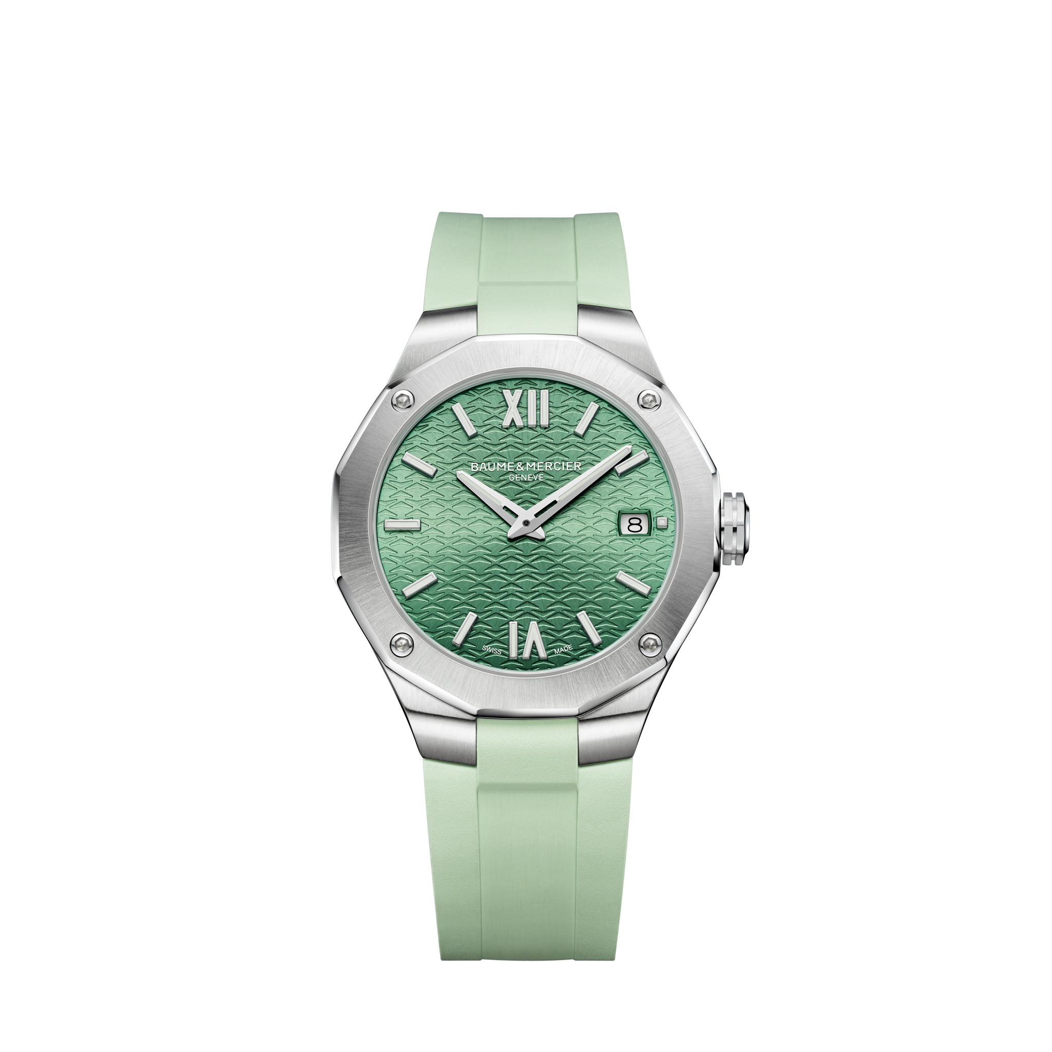 This Riviera quartz watch features a green dial and a matching rubber strap, offering a fresh, modern look. The 36mm stainless steel case, combined with a "Swiss Made" quartz movement, strikes a perfect balance between style and functionality. Water-resistant up to 50 meters, it's an ideal companion.