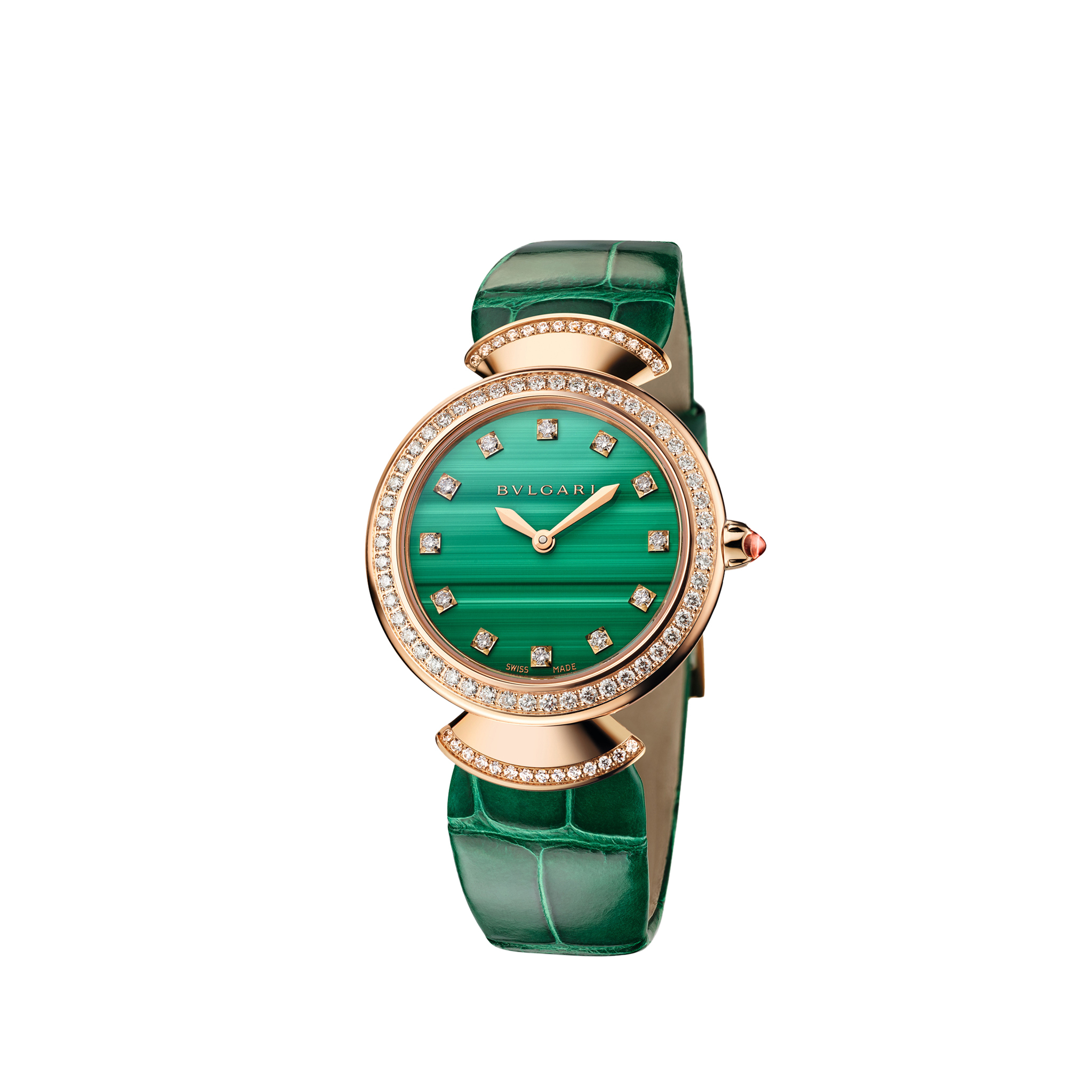 Framing the intense shade of natural gemstones with the delicacy of the fan shape, the Diva's Dream by Bvlgari blends a passion for colour with a refined design. The rose gold case with the diamond-set bezel is fitted with a rose gold crown set with a cabochon-cut rubellite. On the green malachite dial, diamond indices mark the hours. A Quartz movement powers this timepiece, a green alligator strap adds the finishing touch.