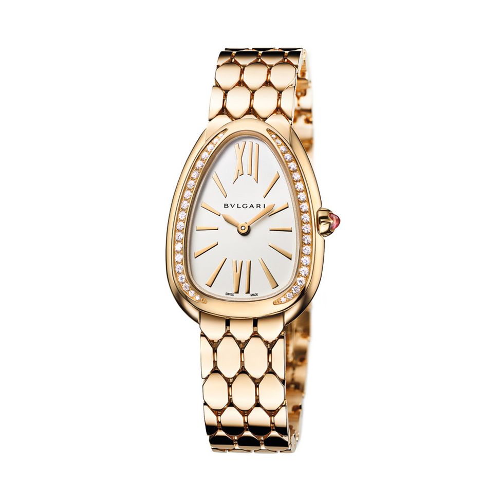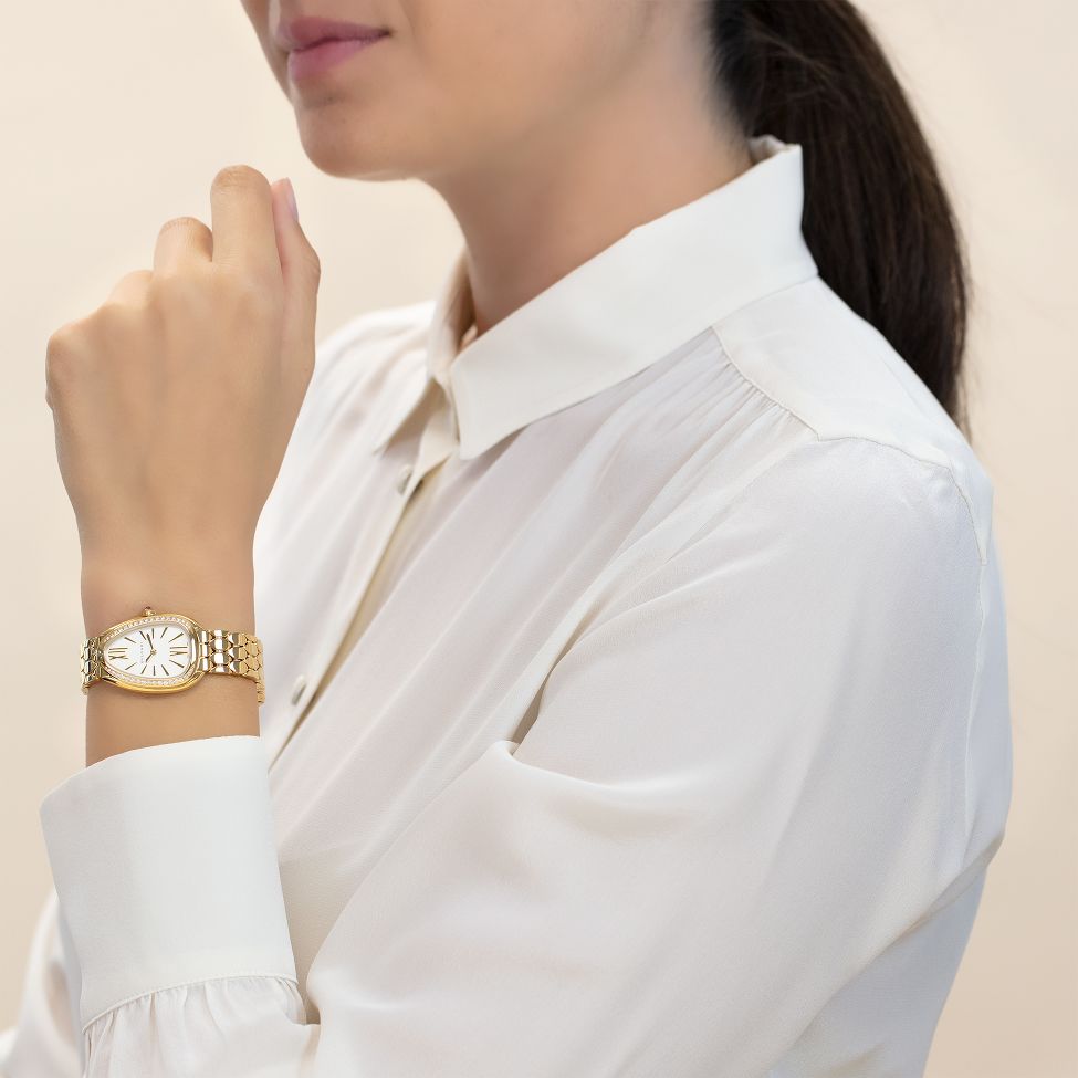 With the Serpenti Seduttori, Bvlgari celebrates the reimagination of a highly feminine icon. The elegant yellow gold case is fitted with a yellow gold, diamond-set bezel, a cabochon-cut pink rubellite decorates the crown. On the white-silver opaline dial, Roman indices mark the hours. A yellow gold link bracelet with a folding clasp adds the finishing touch to this Swiss Made quartz watch.