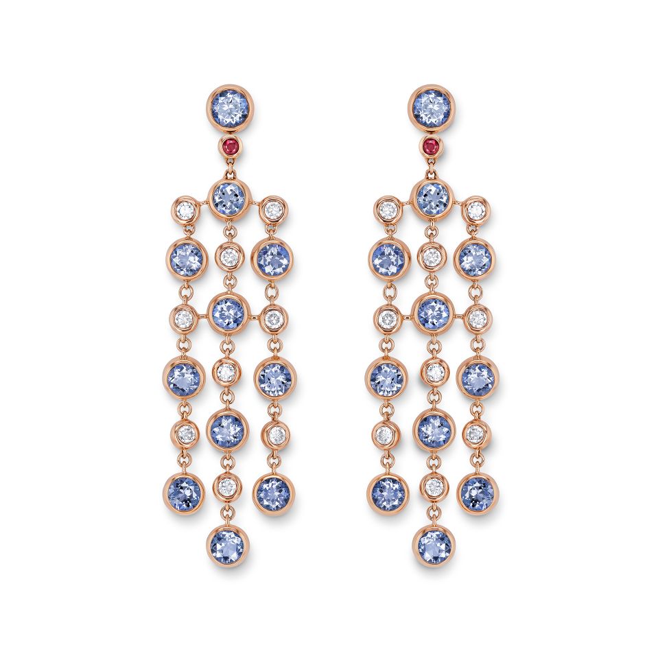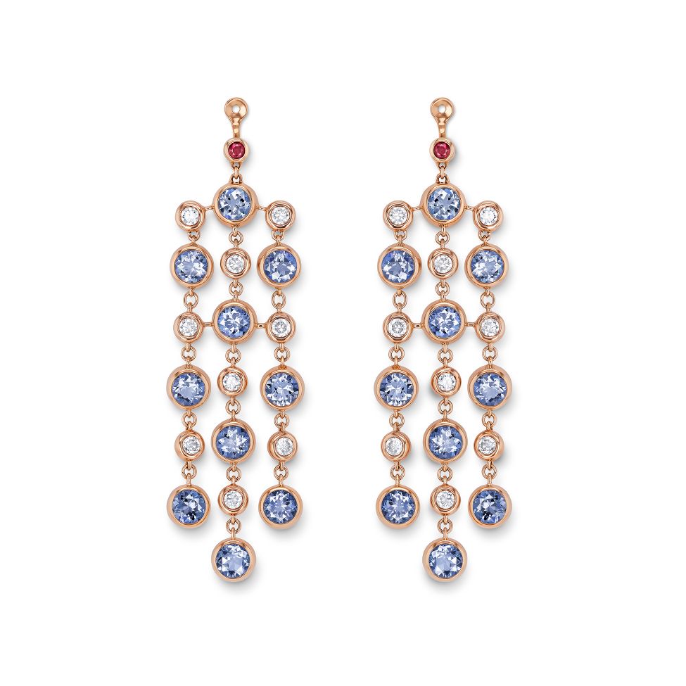 Earring pendants in red gold with 20 blue round tanzanites totalling 7.96 ct and 18 brilliant-cut diamonds totalling 1.25 ct. The pendants can only be worn with Sparks of Fire stud pierced earrings.