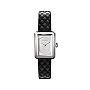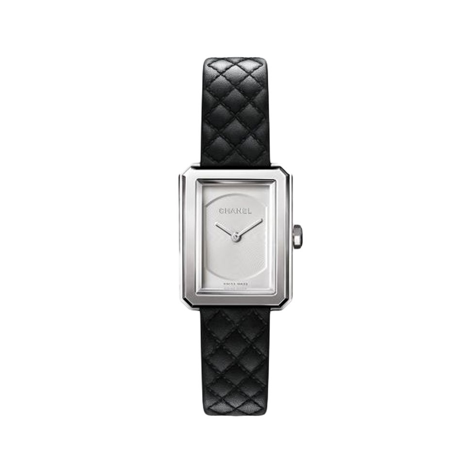 The small BOY·FRIEND Watch by CHANEL presents an alluring blend of beautifully balanced proportions and perfected shapes. The stainless steel case houses the Swiss Made quartz movement. The guilloché opaline dial showcases silver-tone hands and the CHANEL logo. A black calfskin strap with a quilted stitching and a pin buckle adds the finishing touch.