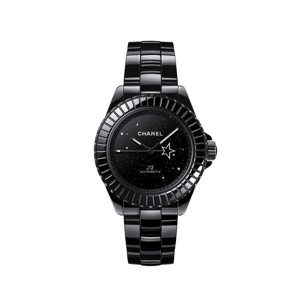 Chanel enters the worlds of science fiction, space, and time travel with the limited edition J12 Interstellar watch. The watch features a case made of black highly resistant ceramic and steel. The dial has a sparkling aventurine effect and is embellished with six diamonds, while the second hand symbolizes a comet passing through the sky. The unique design is achieved by spraying glitter onto the dial, resulting in each piece being slightly different from the next. Additionally, blue luminescence creates a more vivid starry sky scene, adding to its allure. The transparent case back reveals the self-winding, Swiss Made, calibre 12.1 movement with an impressive power reserve of 70 hours. A bracelet made of black highly resistant ceramic adds the finishing touch.