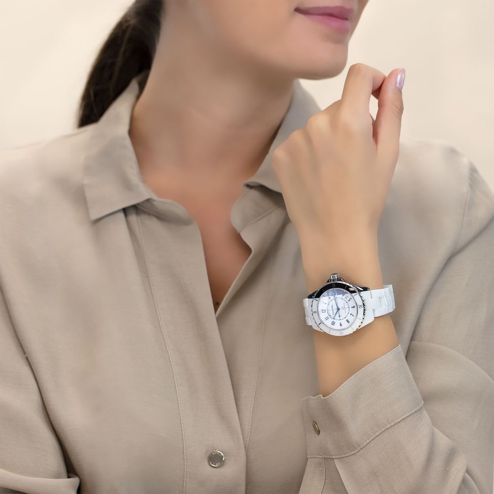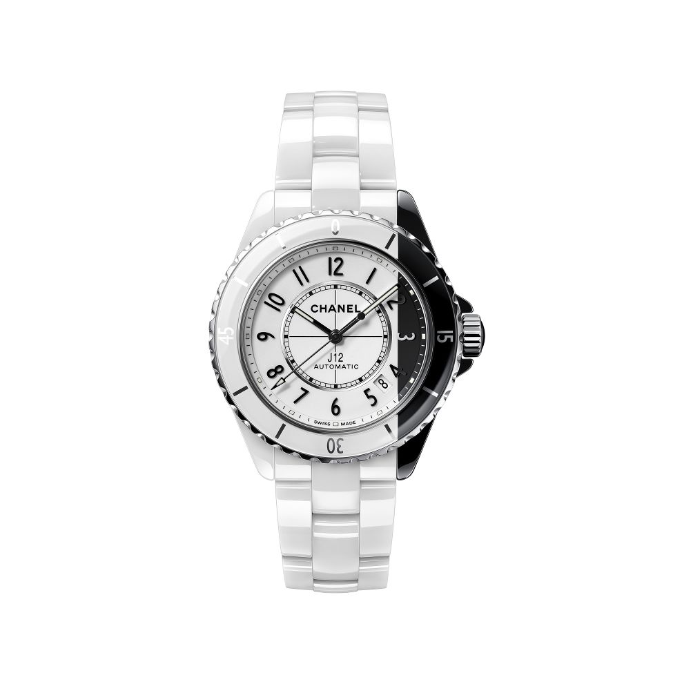 With the J12 Paradoxe, CHANEL takes the iconic design to the next level while preserving the original allure of this collection. The black and white ceramic and stainless steel case features a steel-rimmed unidirectional rotating bezel. It surrounds the black and white lacquered dial with Arabic indices and a date aperture. The transparent case back reveals the self-winding, Swiss Made calibre 12.1. A white ceramic link bracelet with a folding clasp adds the finishing touch.