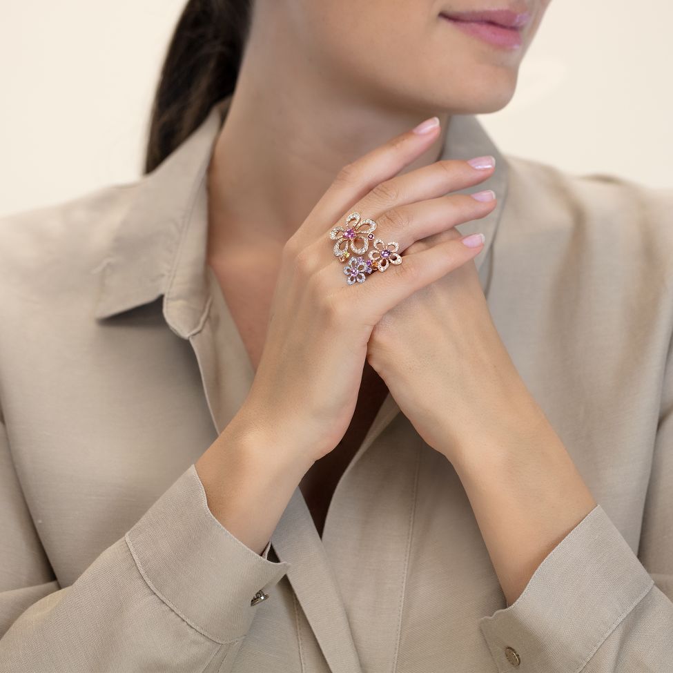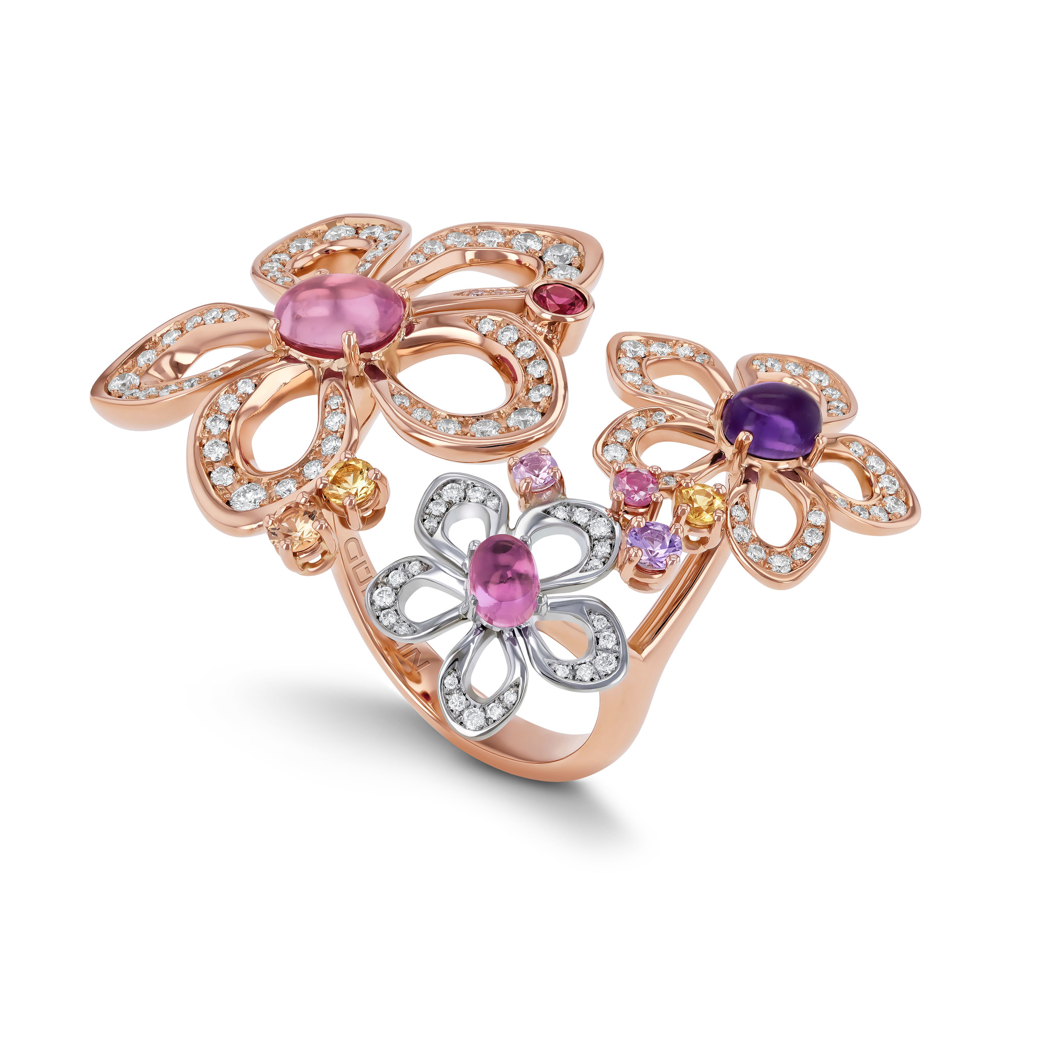 Red and white gold ring with two pink cabochon-cut sapphires of 0.73 ct and 0.19 ct, a violet cabochon-cut amethyst, 0.32 ct, two orange round sapphires, 0.19 ct, three violet round sapphires totalling 0.21 ct, a yellow round sapphire, 0.11 ct, and 114 brilliant-cut diamonds totalling 0.85 ct.