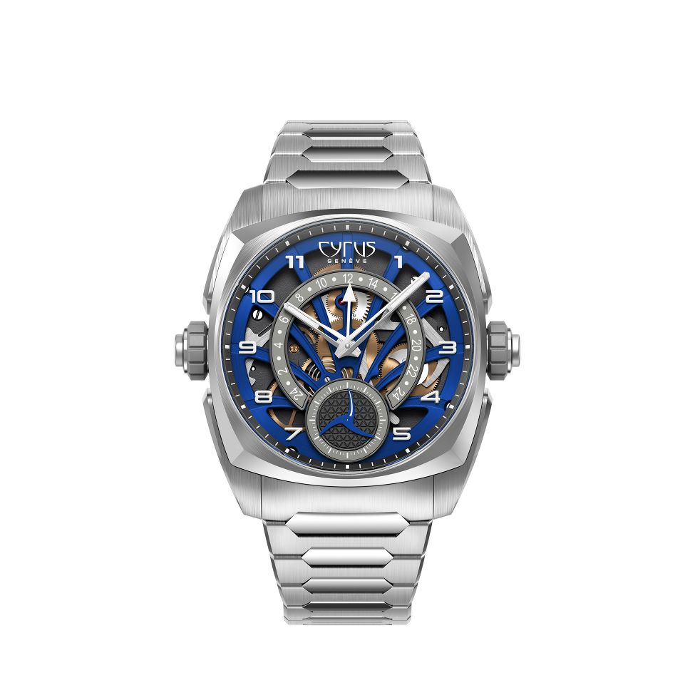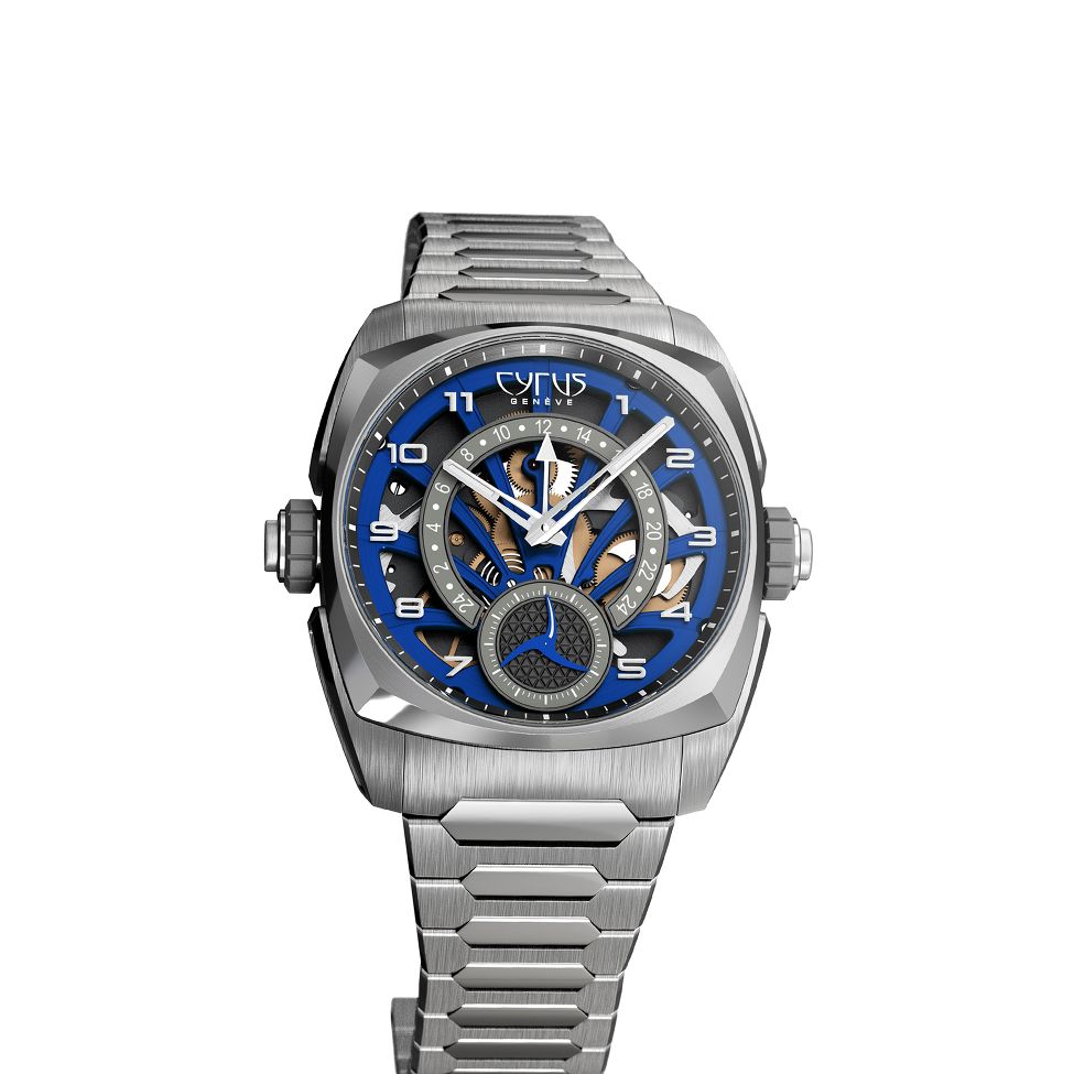 The Klepcys GMT Ocean Blue unites modern design with functionality for global travellers. Its 42 mm titanium case encases the self-winding calibre CYR708 with 278 components and a 55-hour power reserve. Local time is indicated by central hands, while home time appears on a retrograde 24-hour ring with luminous tip. A blue-detailed open-worked dial, sapphire crystals and 100-metre water resistance define this versatile companion.