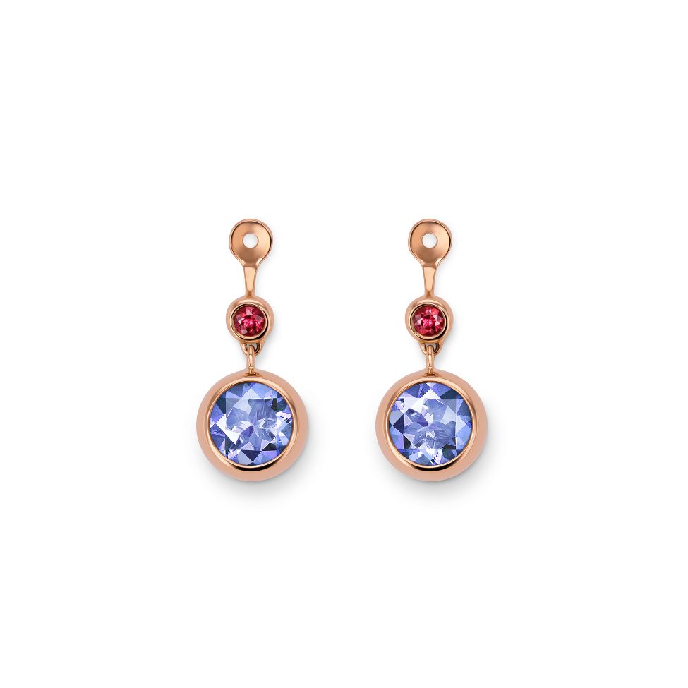 Earring pendants in red gold with two blue round tanzanites totalling 1.94 ct. The pendants can only be worn with stud pierced earrings.